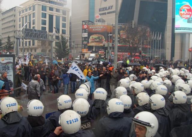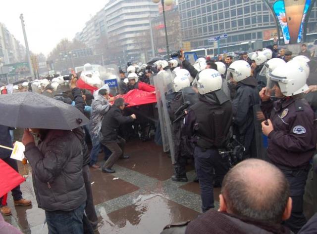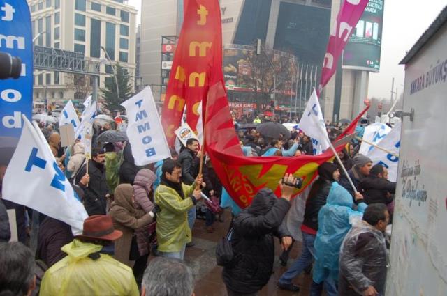 Saat 12.30`dan itibaren Güvenpark`ta toplanmaya başlayan TMMOB yönetici ve üyelerinin basın açıklaması yapmasına izin vermek istemeyen polis kitleye gaz sıkarak ve coplarla saldırdı.
