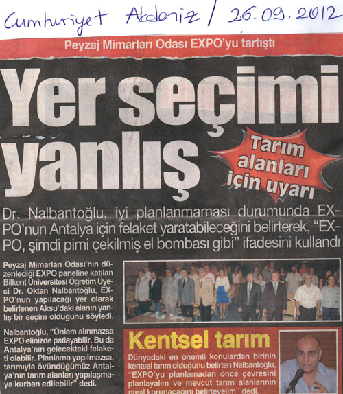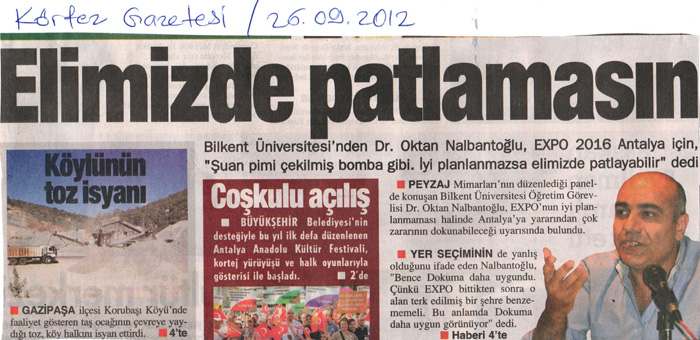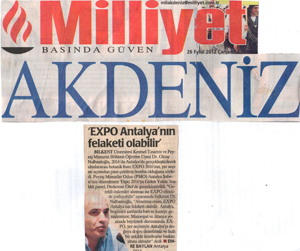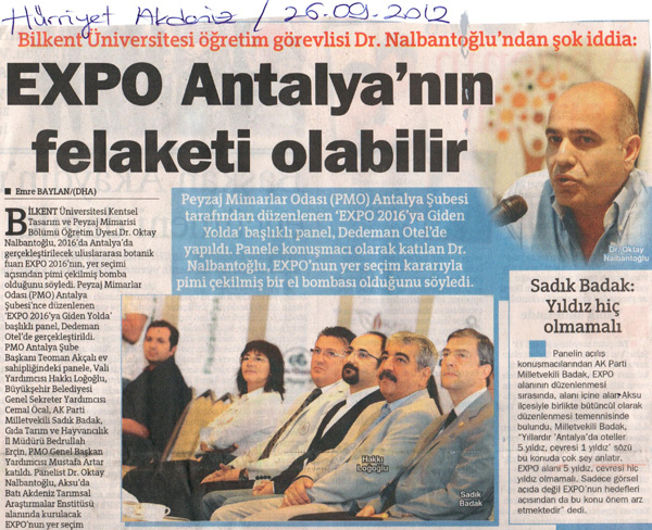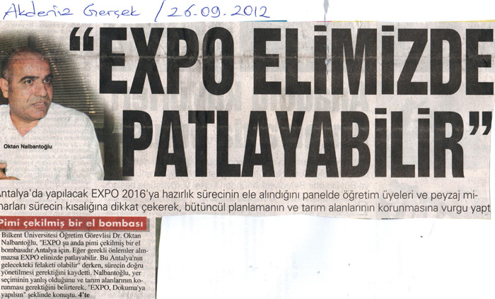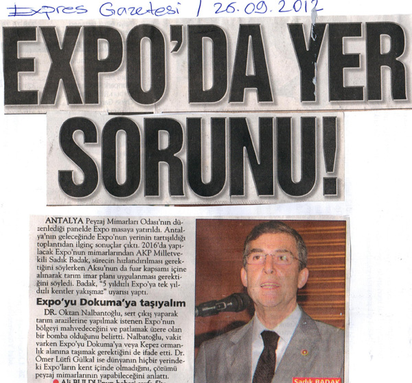 25 Eylül 2012 tarihinde Antalya`da gerçekleştirilen "EXPO 2016`YA GİDEN YOLDA" panelimiz, yerel ve ulusal basında büyük ses getirdi.
