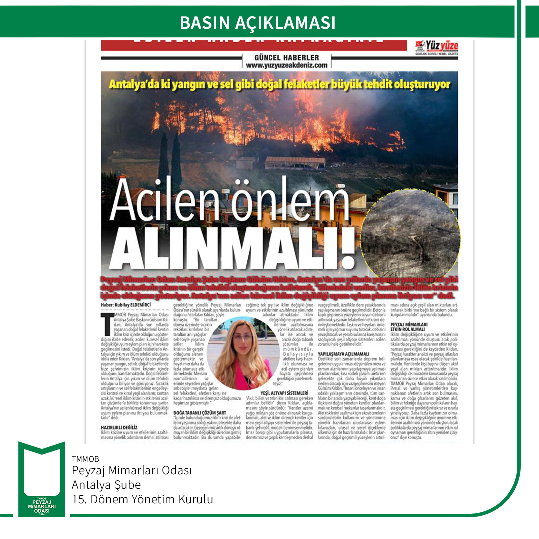 Antalyada son yıllarda yaşanan yangın, sel vb. doğal felaketler de bize şehrimizin iklim krizinin içinde olduğunu kanıtlamaktadır. Doğal felaketlerin Antalya için yıkım ve ölüm tehdidi olduğunu biliyor ve görüyoruz. Sıcaklık artışlarının ve sel felaketlerinin engelleyicisi kentsel ve kırsal yeşil alanların; ranttan uzak, küresel iklim krizinin etkilerini azaltan çözümlerle birlikte korunması şarttır. Antalyanın acilen küresel iklim değişikliği uyum eylem planına ihtiyacı bulunmaktadır.