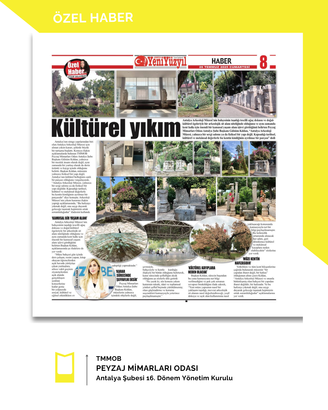 26 Temmuz 2025 tarihinde YeniYüzyıl Gazetesinde Şube Başkanımız Gülsüm KILDAN'ın "Kültürel yıkım! "Antalya Arkeoloji Müzesi kentin kültürel belleği açısından korunmalı" başlıklı haberi basında yer aldı.