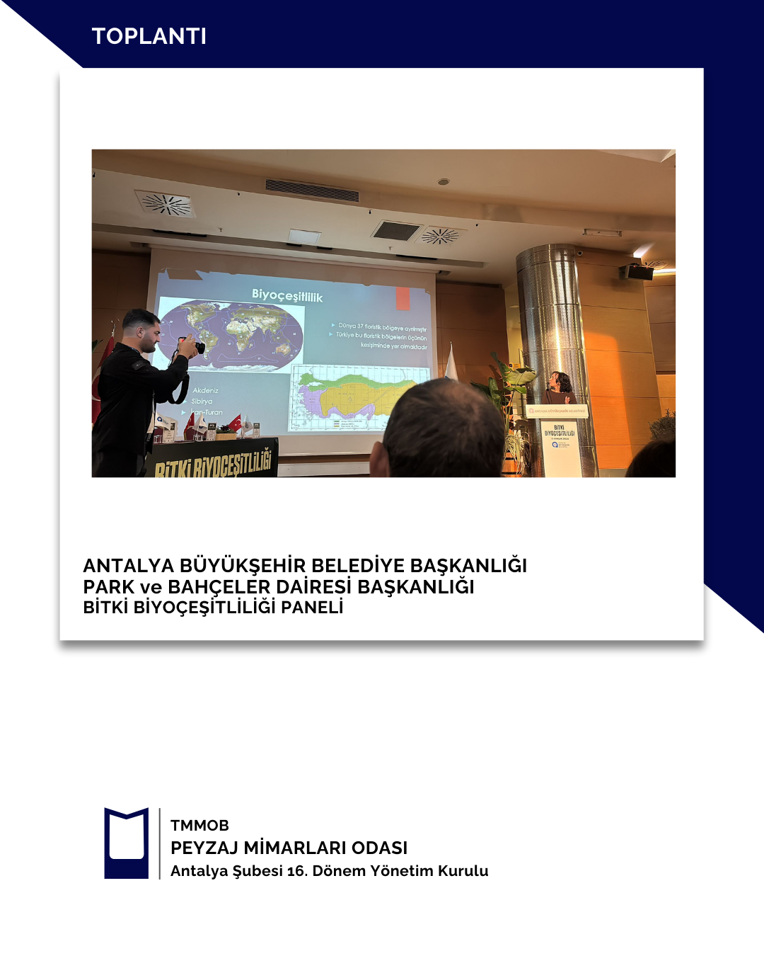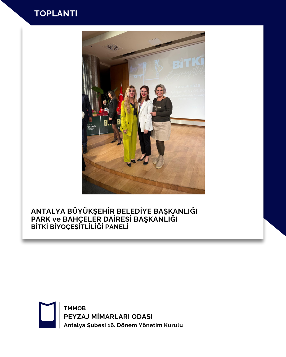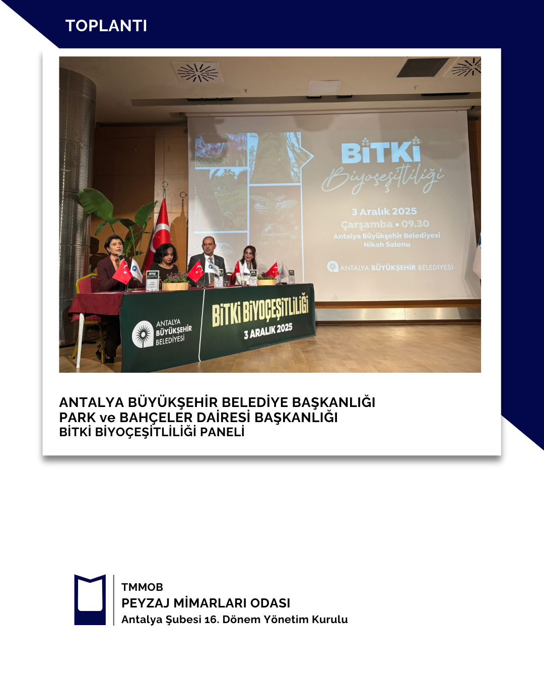 03 Aralık 2025 tarihinde Antalya Büyükşehir Belediye Başkanlığı Park ve Bahçeler Dairesi Başkanlığı tarafından gerçekleştirilen Bitki Biyoçeşitliliği Paneline şubemizi temsilen Şube Başkanı Gülsüm KILDAN katılım sağlamıştır.