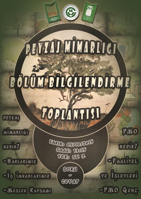 Çukurova Üniversitesi PMOGenç öğrencileri Peyzaj Mimarlığı Bölümüne yeni başlayan öğrencilerimize hoşgeldiniz toplantısını 5 Ekim 2015 Pazartesi günü saat 13.15`te bölüm dersliği olan Stüdyo-1 dersliğinde gerçekleştirildi. Hem eğitime yeni başlayan hem de 1. 2. ve 3 sınıf öğrencilerine "Neden Peyzaj Mimarları Odası ve Genç örgütlenme" konularında bilgi aktarımında bulundu.