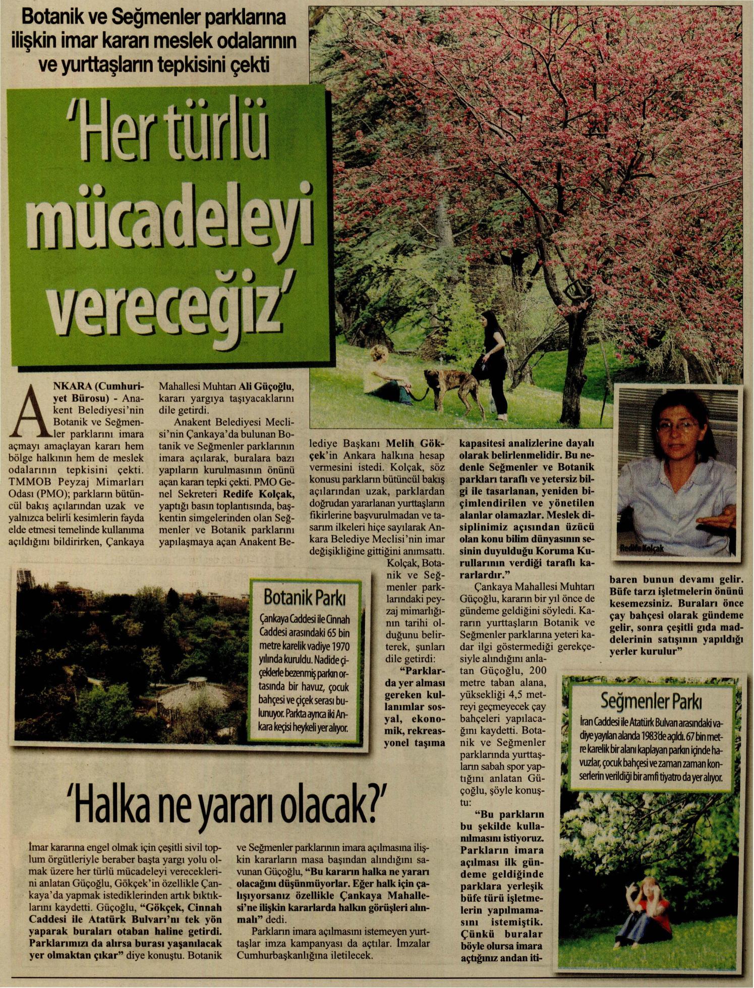 PMO Genel Sekreteri Redife Kolçak, yaptığı basın toplantısında, başkentin simgelerinden olan Seğmenler ve Botanik parklarını yapılaşmaya açan Anakent Belediye Başkanı Melih Gökçek`in Ankara halkına hesap vermesini istedi.