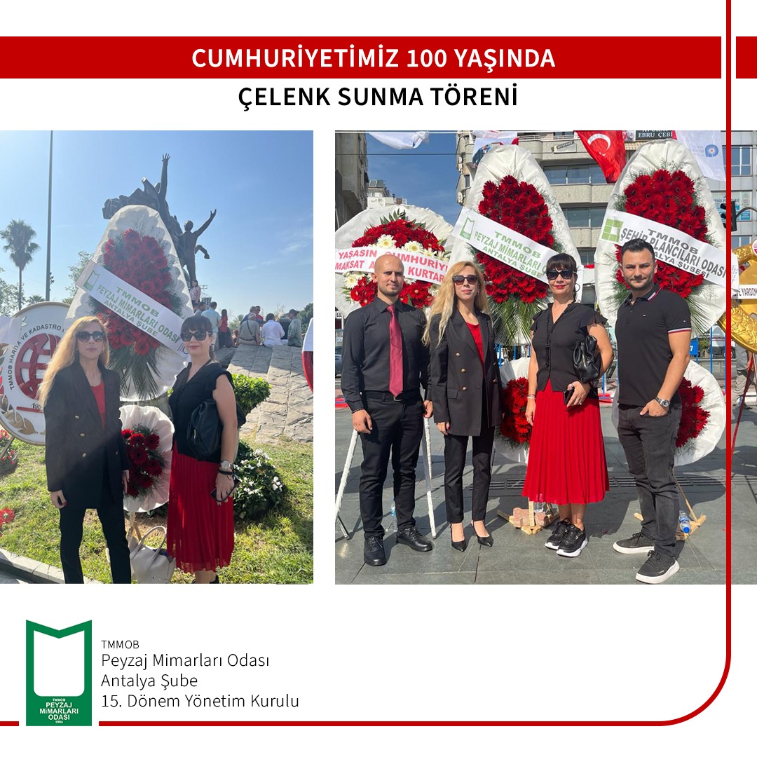 Antalya Valiliği Resmî Çelenk Bırakma Töreni`ne TMMOB Peyzaj Mimarları Odası Antalya Şube adına Başkan Gülsüm Kıldan, Yazman Omca Coşarcan Kaya, Üye Süleyman Aydoğmuş, Üye Yaşar Tuğsan Çokergin katılım sağlamıştır.