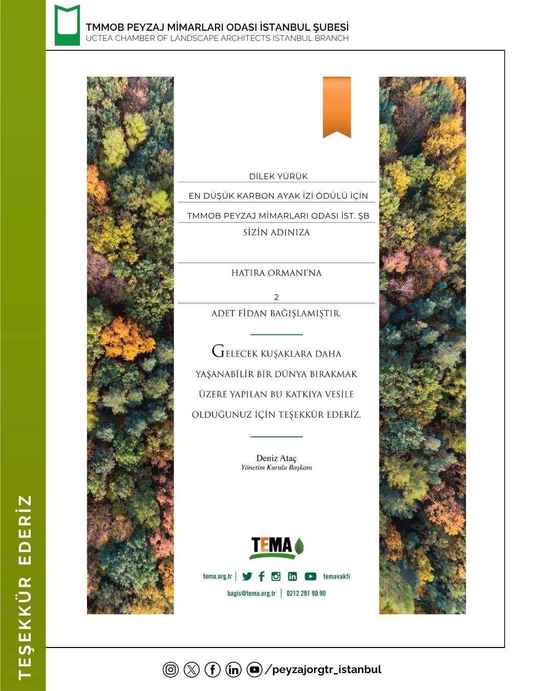 Bu kapsamda, sürdürülebilir yaşam farkındalığını desteklemek adına Sn. Dilek Yürük için TEMA Vakfı’na bağış gerçekleştirilmiştir.
