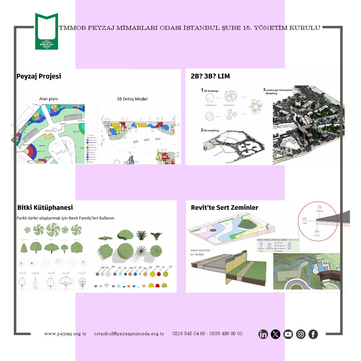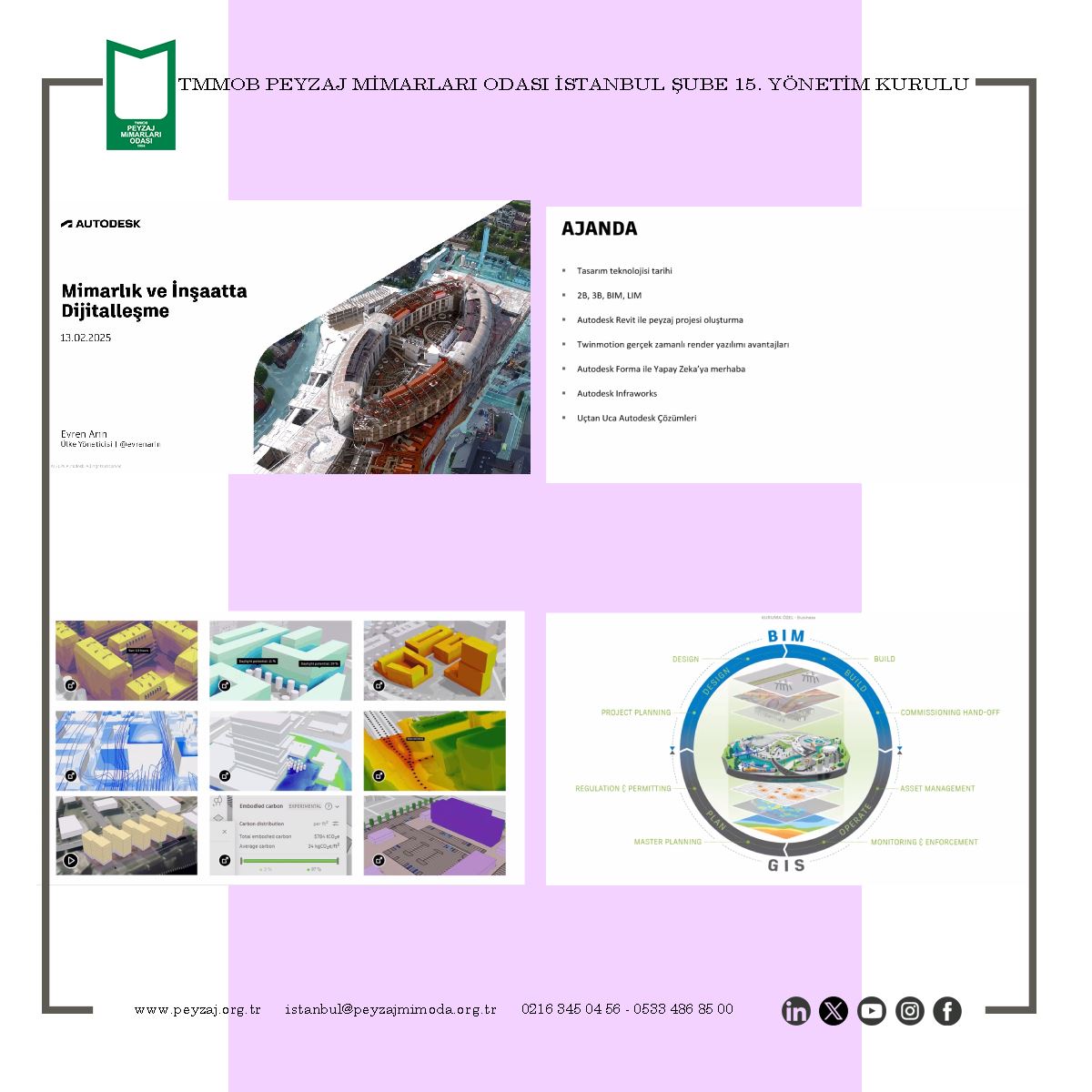TMMOB Peyzaj Mimarları Odası İstanbul Şubesi olarak; Autodesk Türkiye Temsilciliği ile ortaklaşa düzenlenen “Geleceği Çizen Teknoloji: Autodesk” sunumumuzu Penta Teknoloji Ürünleri Dağıtım Ticaret A.Ş katkıları ile 13 Şubat 2025 Perşembe günü çevrim içi olarak gerçekleştirdik.