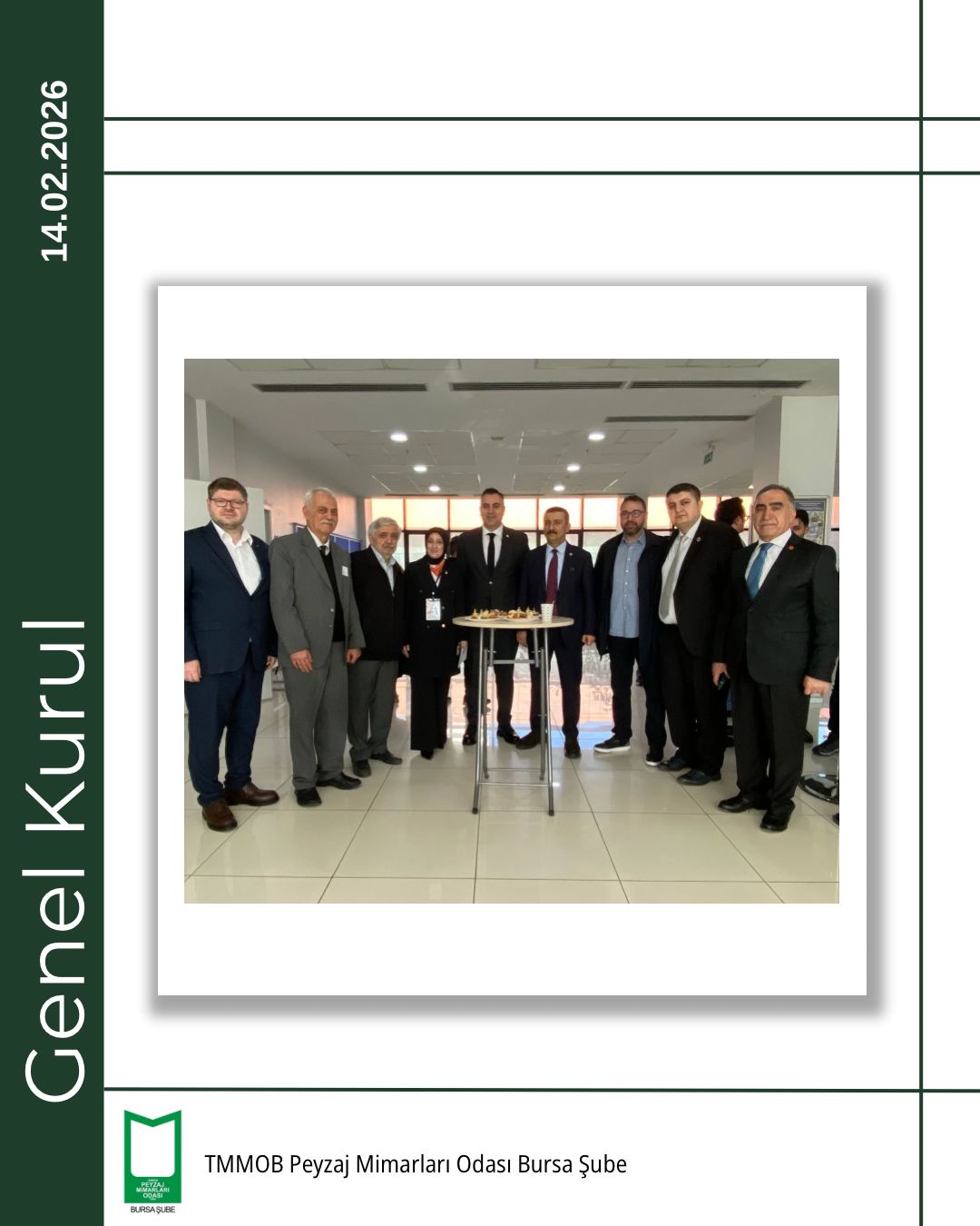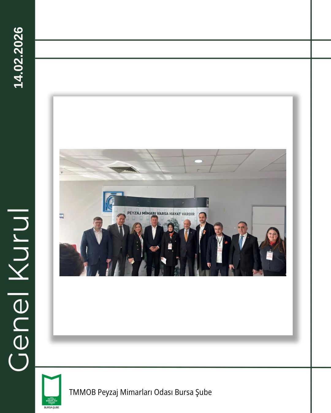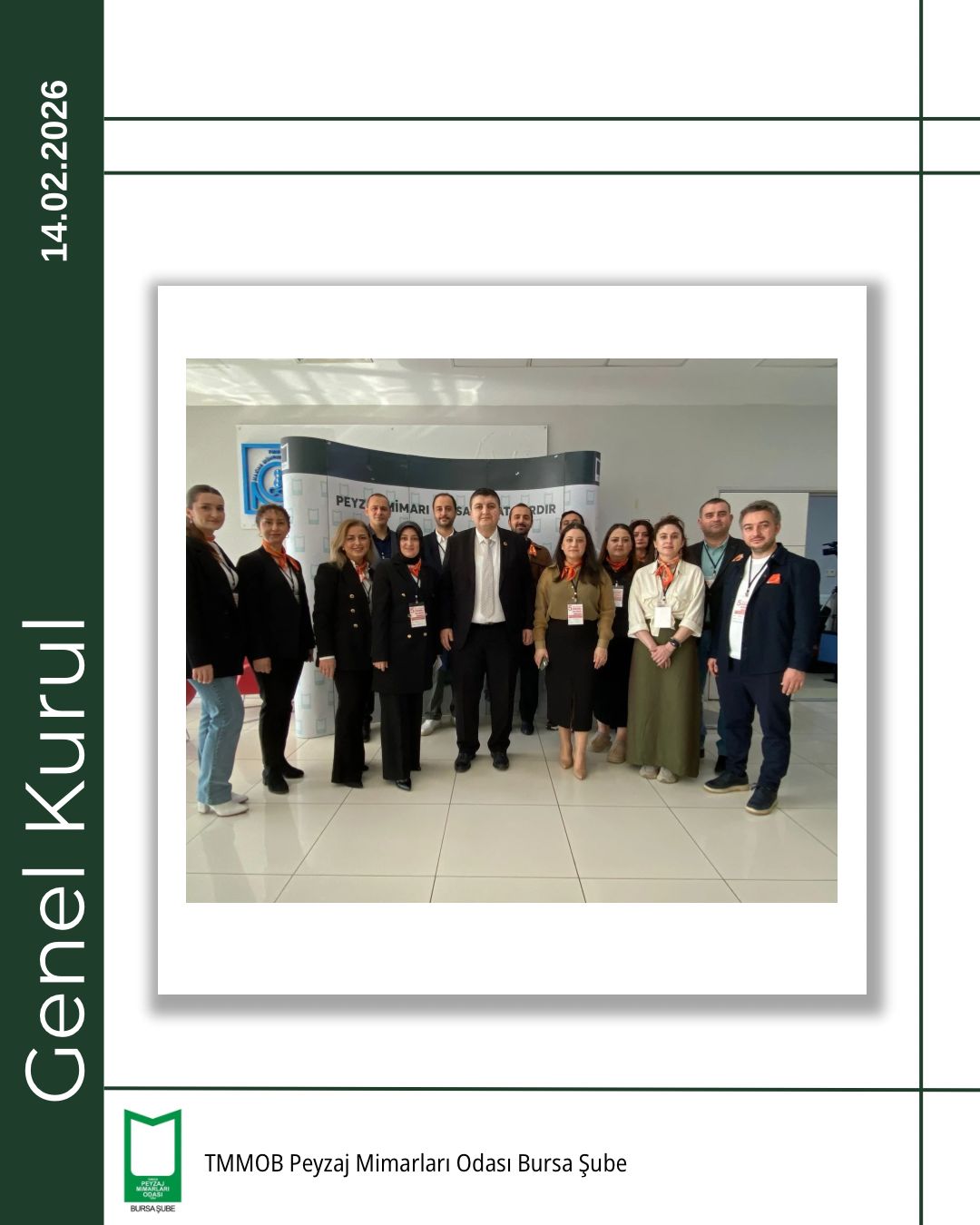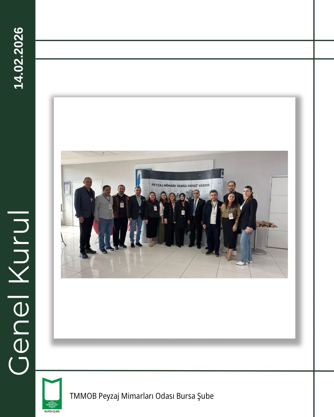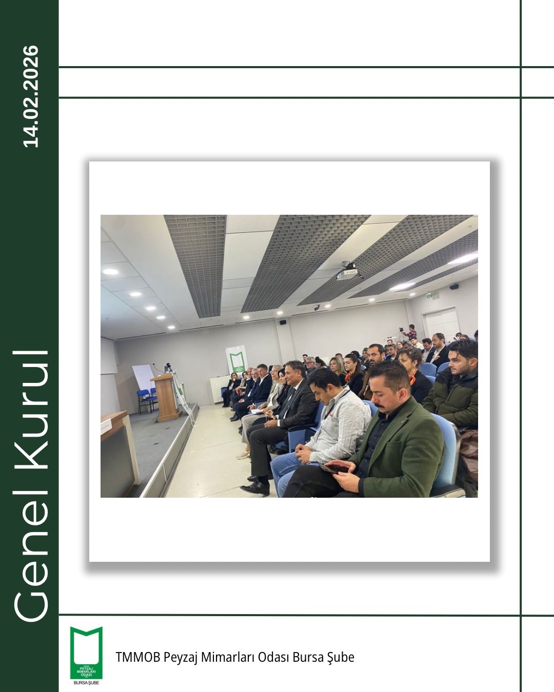 TMMOB Peyzaj Mimarları Odası Bursa Şubesi 5. Olağan Genel Kurulu, 14 Şubat 2026 tarihinde Bursa Akademik Odalar Birliği (BAOB) Yerleşkesi’nde, TMMOB Makina Mühendisleri Odası Bursa Şubesi Konferans Salonu’nda gerçekleştirildi.