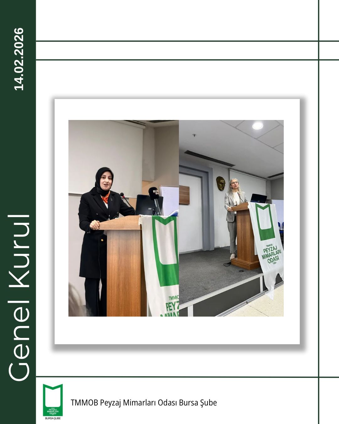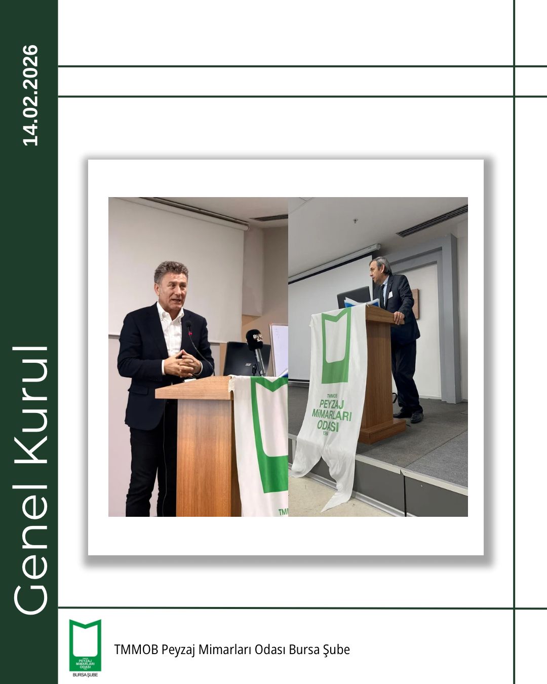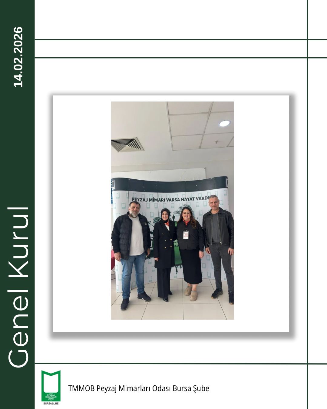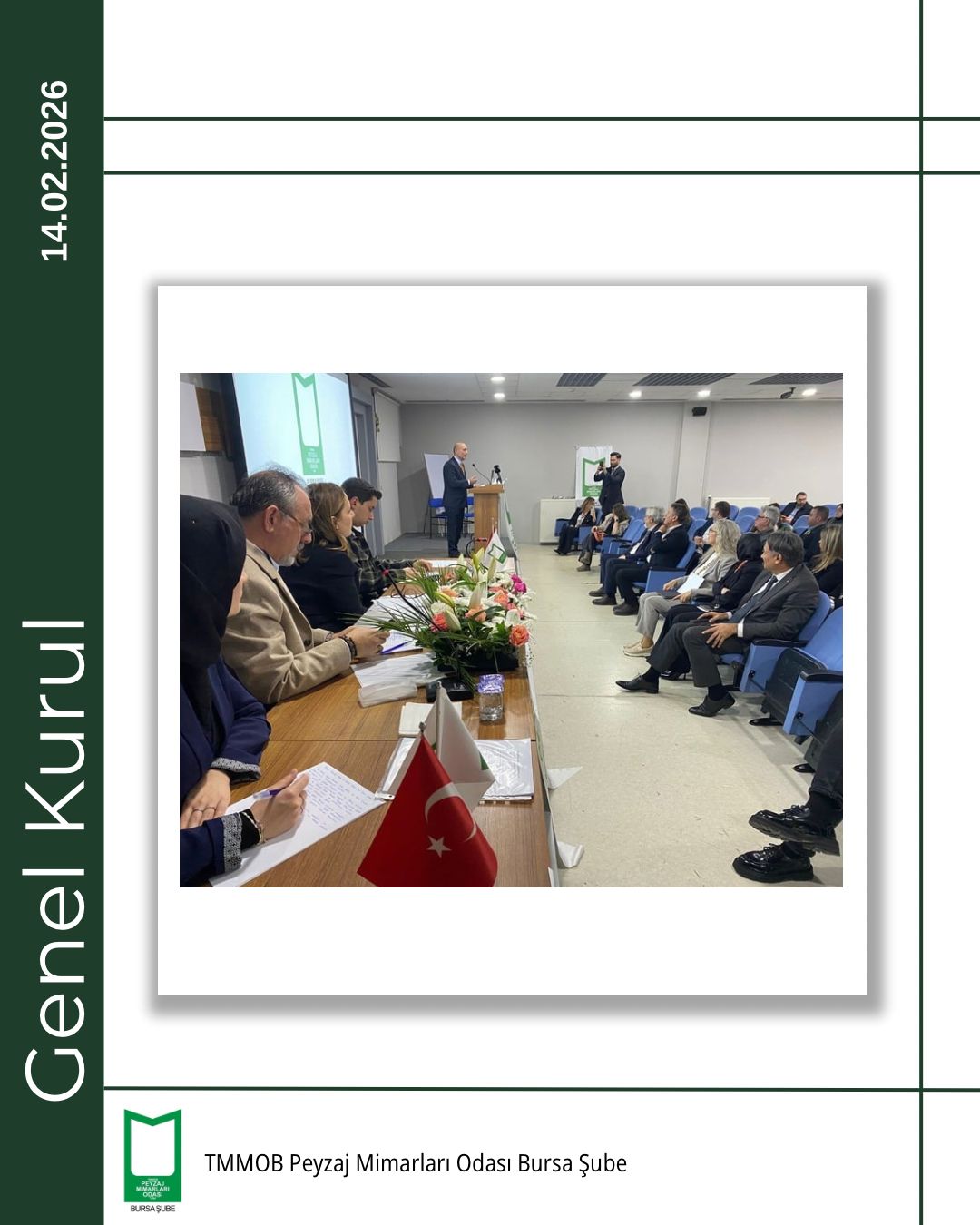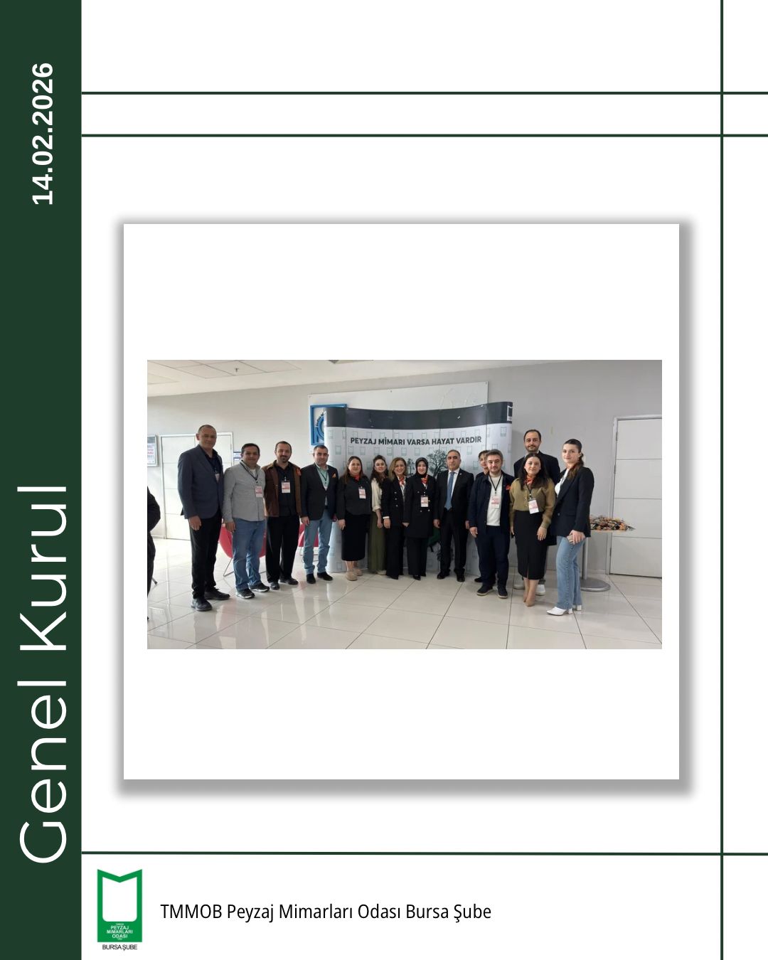 TMMOB Peyzaj Mimarları Odası Bursa Şubesi 5. Olağan Genel Kurulu, 14 Şubat 2026 tarihinde Bursa Akademik Odalar Birliği (BAOB) Yerleşkesi’nde, TMMOB Makina Mühendisleri Odası Bursa Şubesi Konferans Salonu’nda gerçekleştirildi.