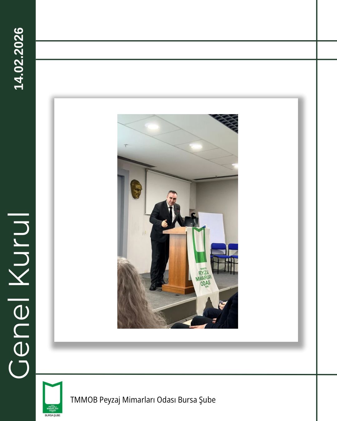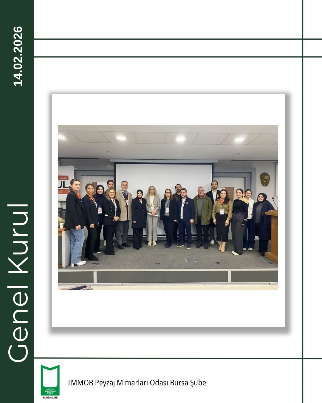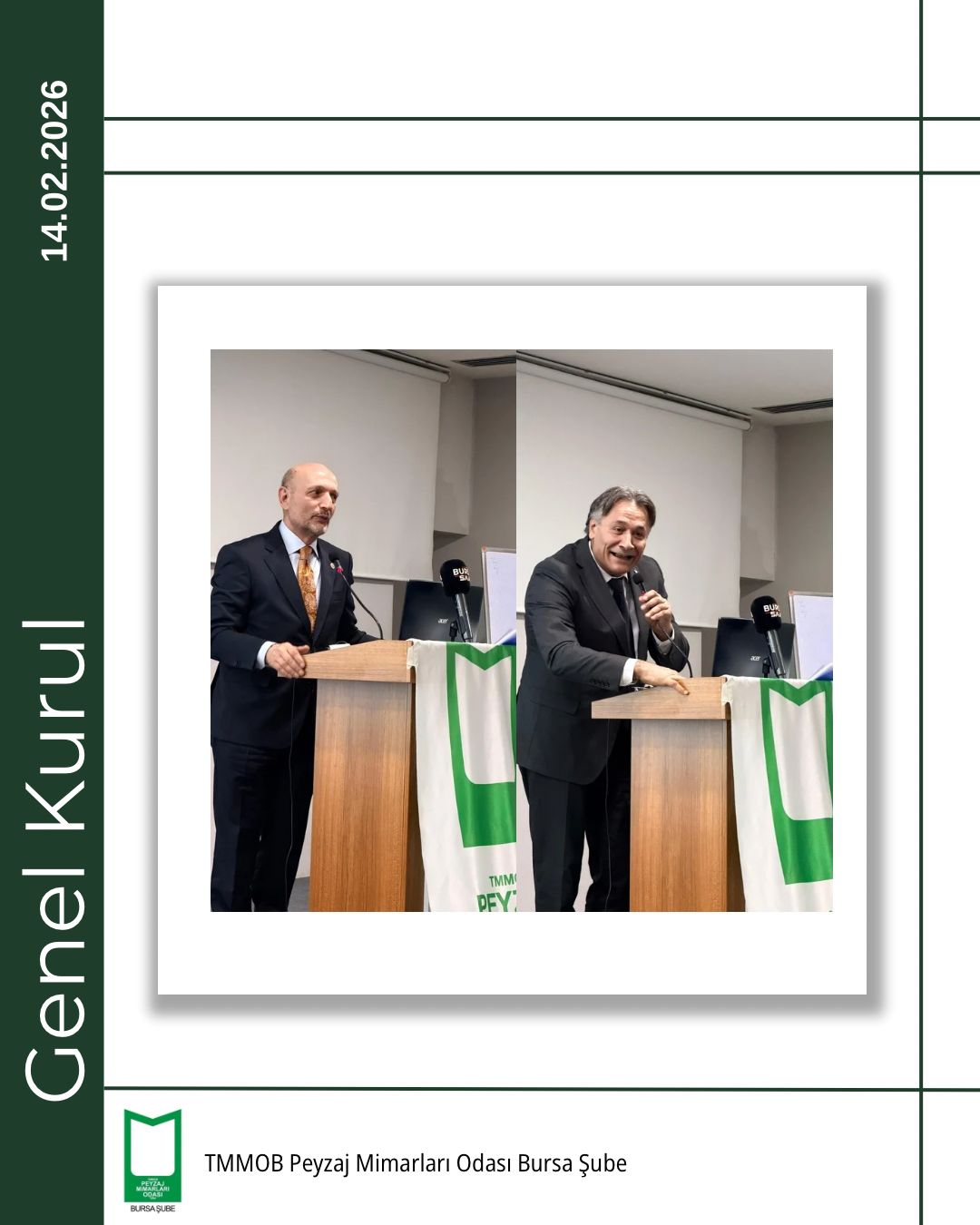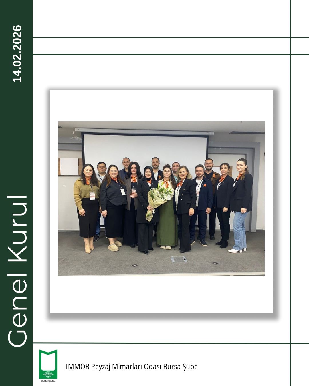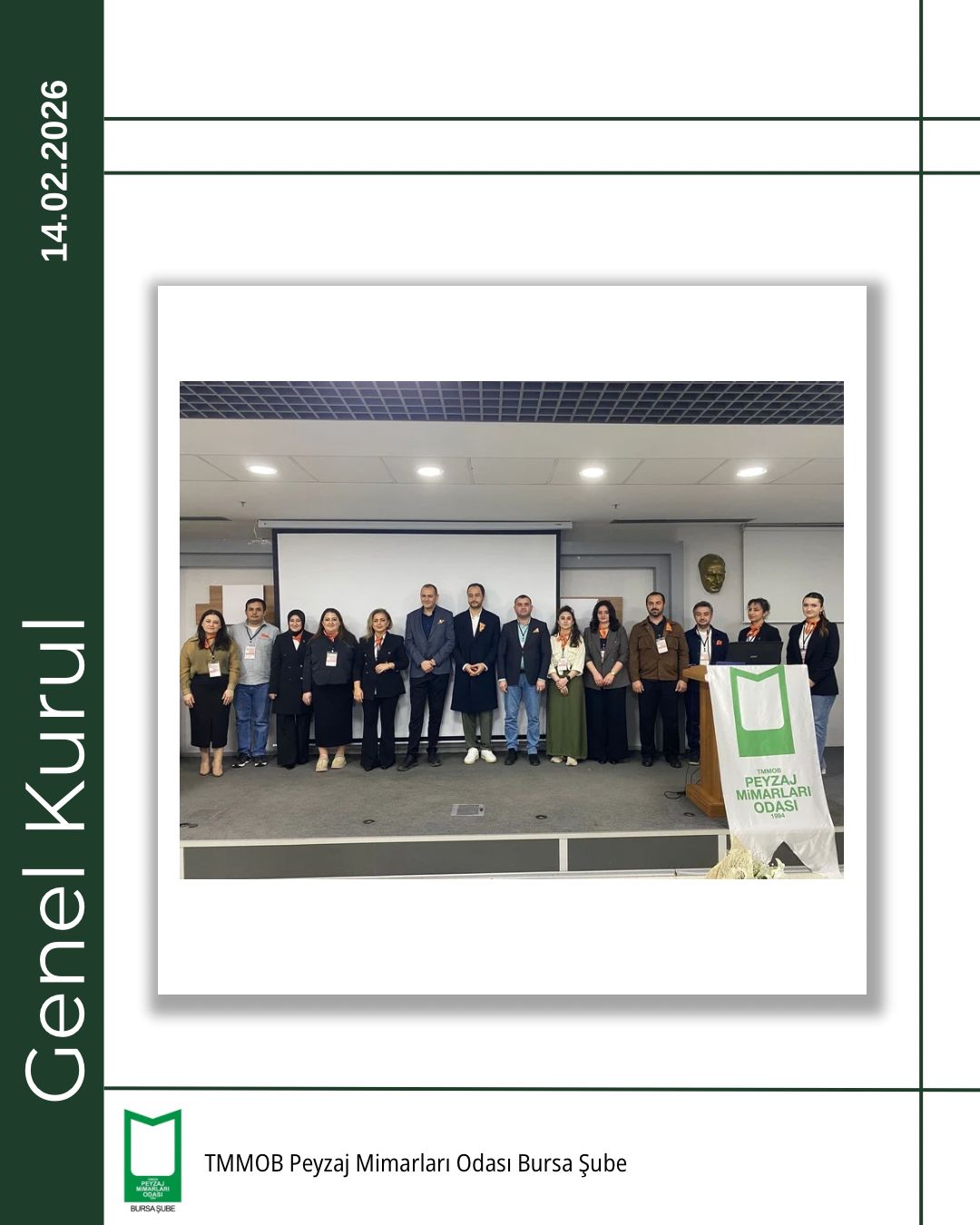 TMMOB Peyzaj Mimarları Odası Bursa Şubesi 5. Olağan Genel Kurulu, 14 Şubat 2026 tarihinde Bursa Akademik Odalar Birliği (BAOB) Yerleşkesi’nde, TMMOB Makina Mühendisleri Odası Bursa Şubesi Konferans Salonu’nda gerçekleştirildi.