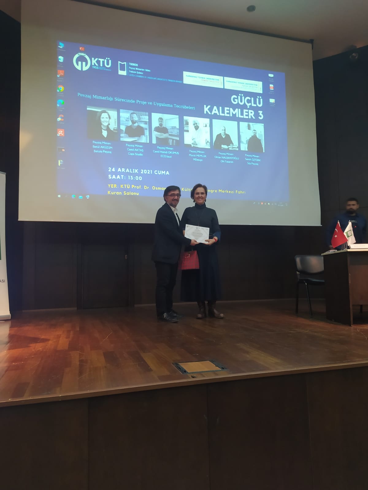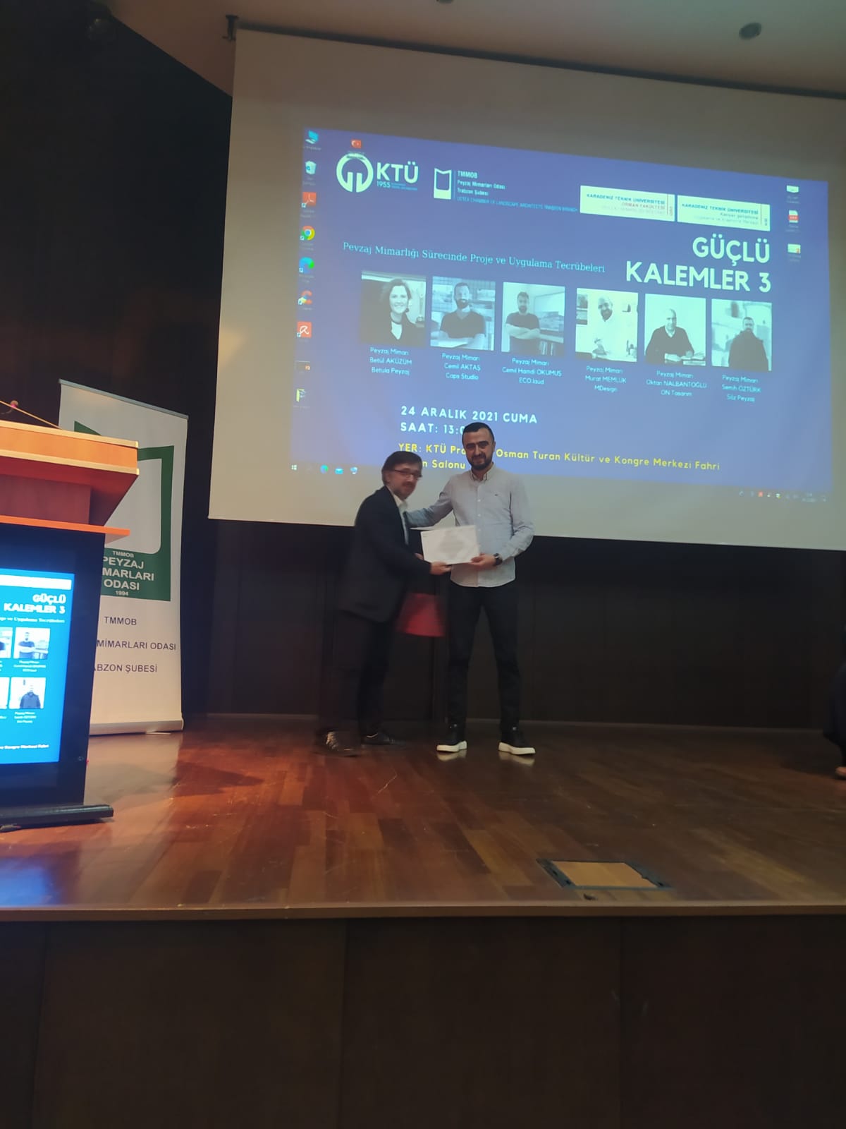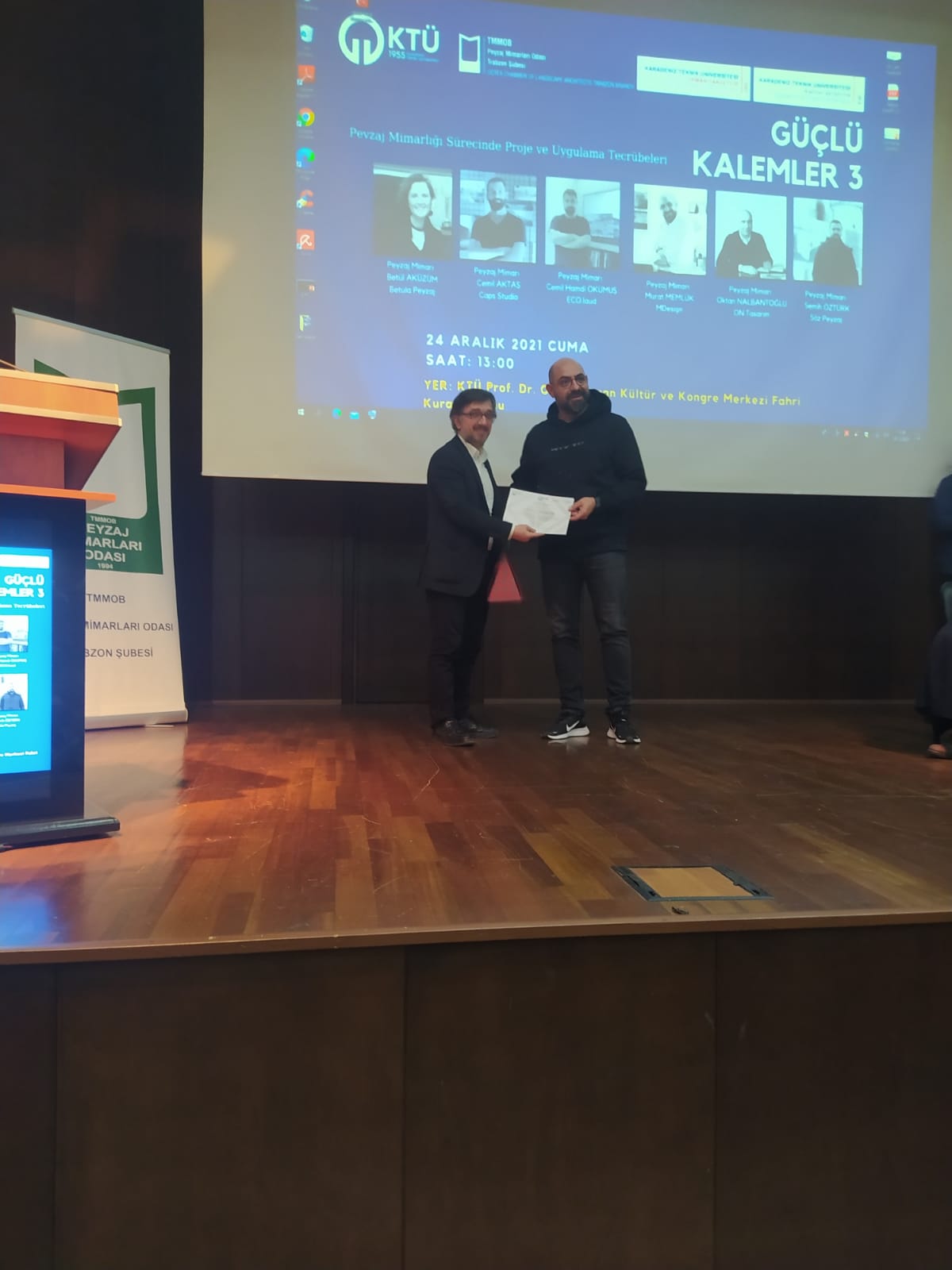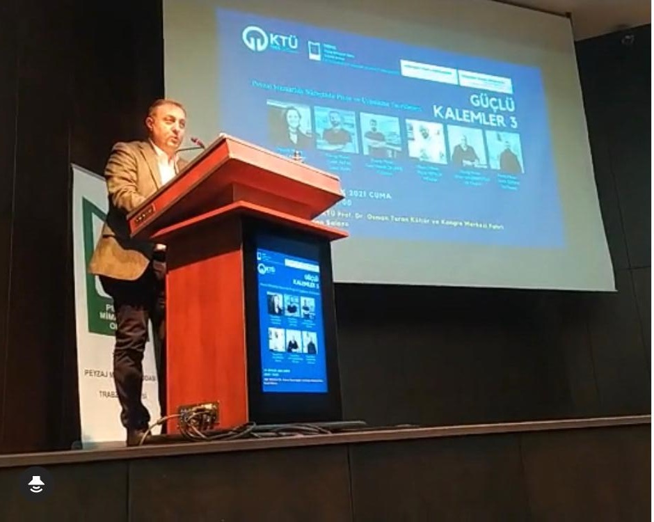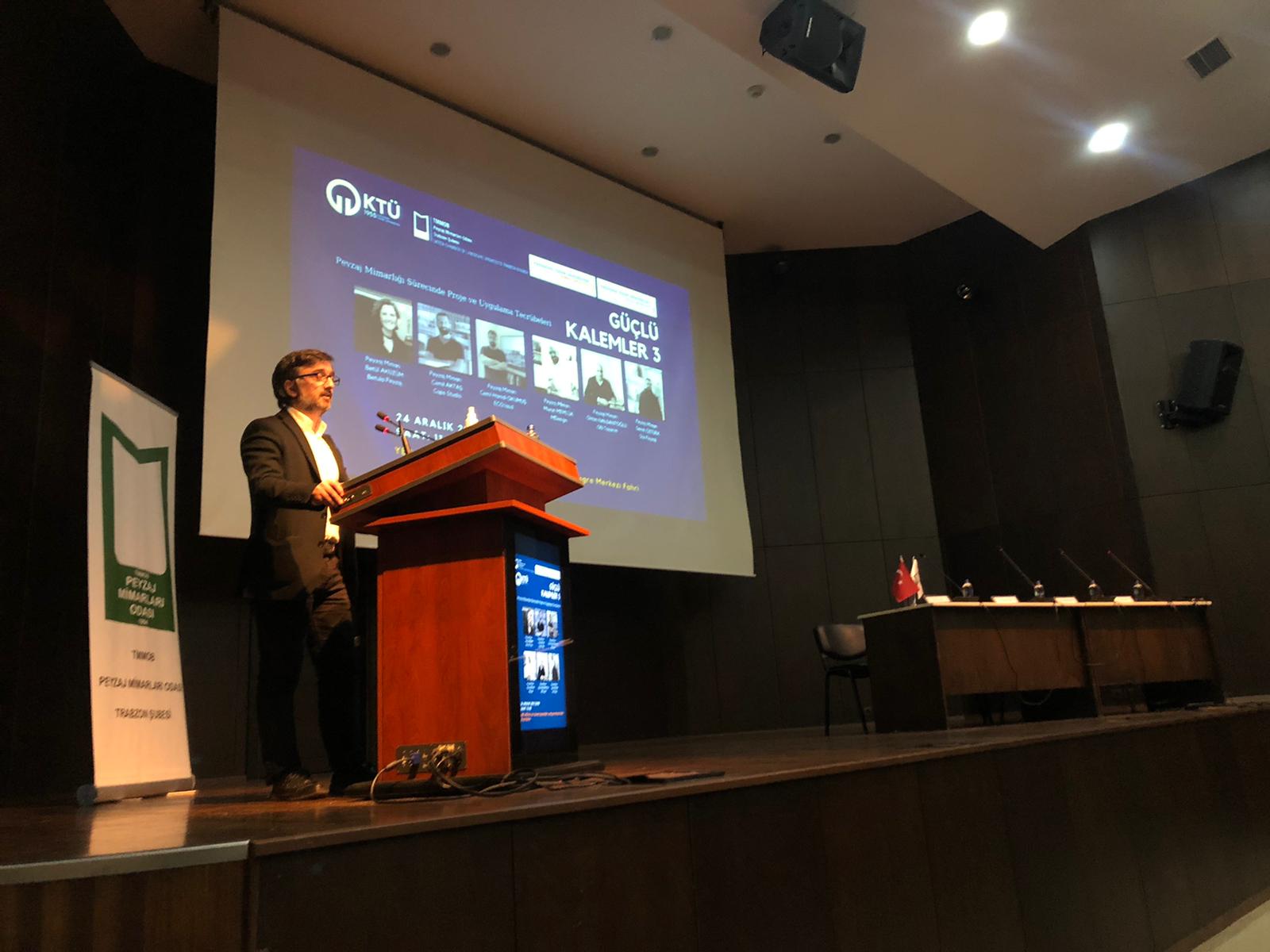 TMMOB Peyzaj Mimarları Odası Trabzon Şubesi Yönetim Kurulu , KTÜ Peyzaj Mimarlığı Bölümü ve KTÜ Kariyer Geliştirme , Uygulama ve Araştırma Merkezi iş birliği ile "Peyzaj Mimarlığı Sürecinde Proje ve Uygulama Tecrübeleri" konulu GÜÇLÜ KALEMLER - 3 söyleşi programı 24 Aralık 2021 tarihinde KTÜ Prof. Dr. Osman Turan Kültür Merkezinde gerçekleştirildi.