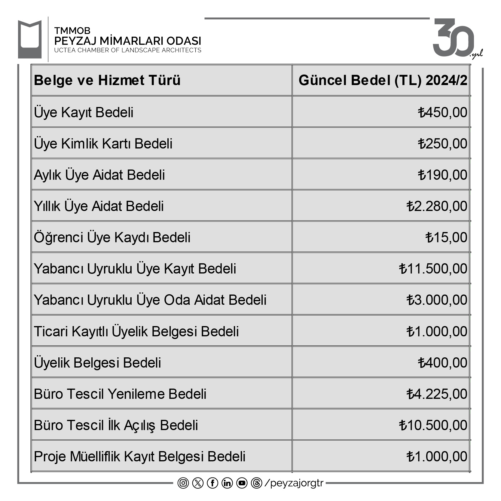 12 Haziran 2024 günü duyurduğumuz Odamızın aidat, belge ve hizmet bedellerinde ortalama %55 oranında artış yapıldığına dair paylaşımımızın ardından ülkemizin 9 günlük bayram tatiline girmesiyle iş gününün yeterli olmaması sebebiyle gelen talepler doğrultusunda güncellenen üye aidat, belge ve hizmet bedelleri için son ödeme tarihi 16 Temmuz 2024 mesai bitimine kadar uzatılmıştır.Oda Ana Yönetmeliğimizin 125. Maddesi gereği geçmiş yıllara ait üye aidat ödenti borçları, borcun ödendiği tarihteki aidat miktarı üzerinden tahsil edileceğinden, MAĞDURİYET YAŞAMAMANIZ İÇİN GÜNCELLENEN AİDAT BEDELİNİN 95 TL ÜZERİNDEN ÖDENEBİLECEĞİ SON TARİH 16 TEMMUZ 2024 TARİHİ MESAİ BİTİMİNE KADAR UZATILMIŞTIR, aksi takdirde tüm aidat ödenti borçlarının aylık 190 TL üzerinden hesaplanacağını önemle bildiririz.2024 yılı sonuna kadar olan tüm üye aidat ödentilerinizi 95 TL’den ödemek için son gün 16 Temmuz 2024.Saygılarımızla.TMMOB Peyzaj Mimarları Odası16. Dönem Yönetim Kurulu2024 YILI (TEMMUZ-ARALIK) BELGE VE HİZMET BEDELLERİ