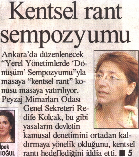TMMOB tarafından gerçekleştirilen sekreteryası Peyzaj Mimarları Odası‘nca yürütülen sempozyum , geniş bir katılımla 17-19 Ekim tarihleri arasında Ankara‘ da gerçekleştirilecek. "Yerel Yönetimler Yasası" ile gündeme geldiği ilk günden bu yana eleştiri oklarının hedefi olan , Meclis , Bayındırlık ve İmar Komisyonu‘ nda onaylandıktan sonra geçtiğimiz aylarda Genel kurul‘ a inen "Dönüşüm Alanları Yasa Tasarısı" , her yönüyle sempozyumda masaya yatırılacak. Çıkarılan ve çıkarılmakta olan bu gibi yasaların devletin kamusal denetimini ortadan kaldırmaya yönelik olduğunu, kentsel rantı hedeflediğini belirtti.