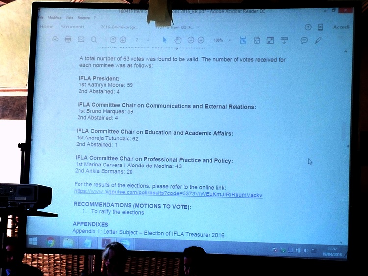 2 yılda bir gerçekleştirilen ve bu yıl delegelerin katılımıyla internet üzerinden yapılan IFLA Yönetim Kurulu seçimlerinin sonuçları da Dünya Konseyi‘nde açıklandı. IFLA Başkanı Kathryn Moore, IFLA İletişim ve Dış İlişkiler Komitesi Başkanı Bruno Marques, IFLA Eğitim ve Akademik İlişkiler Komitesi Başkanı Andreja Tutundzic 2 yıl daha görevine devam ederken, IFLA Mesleki Uygulama ve Politikalar Komitesi Başkanı Carlo Bruschi bu yıl aday olmadı. Komite Başkanlığına aday olarak 20 oy alan Ankia Bormans karşısında 43 oy alan Marina Cervera Alonso de Medina seçildi.