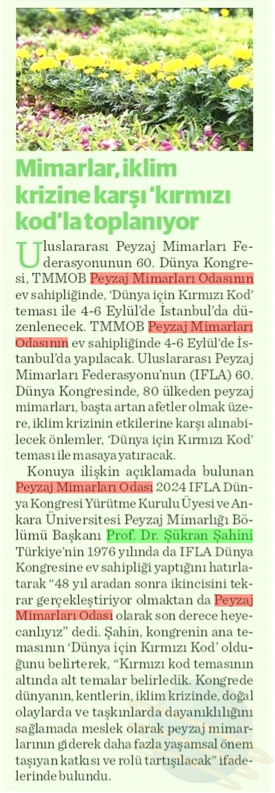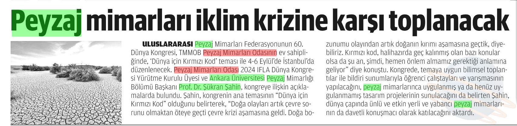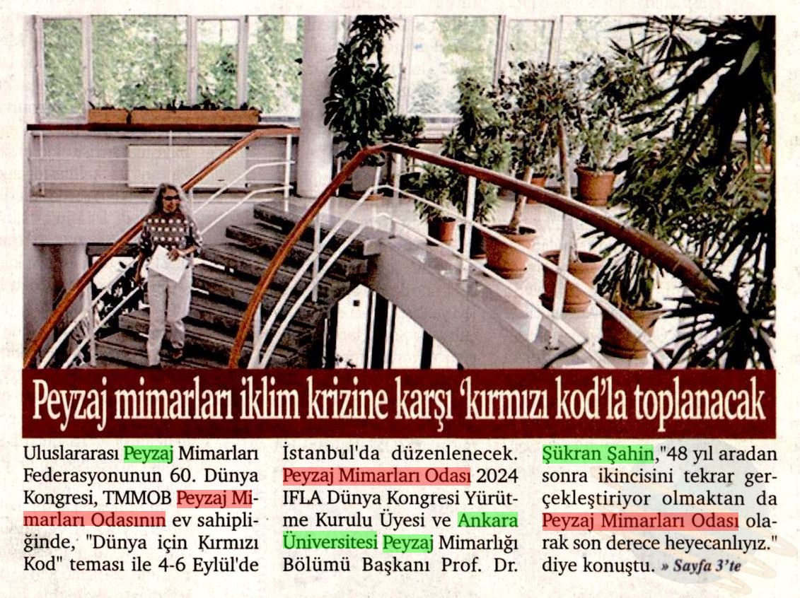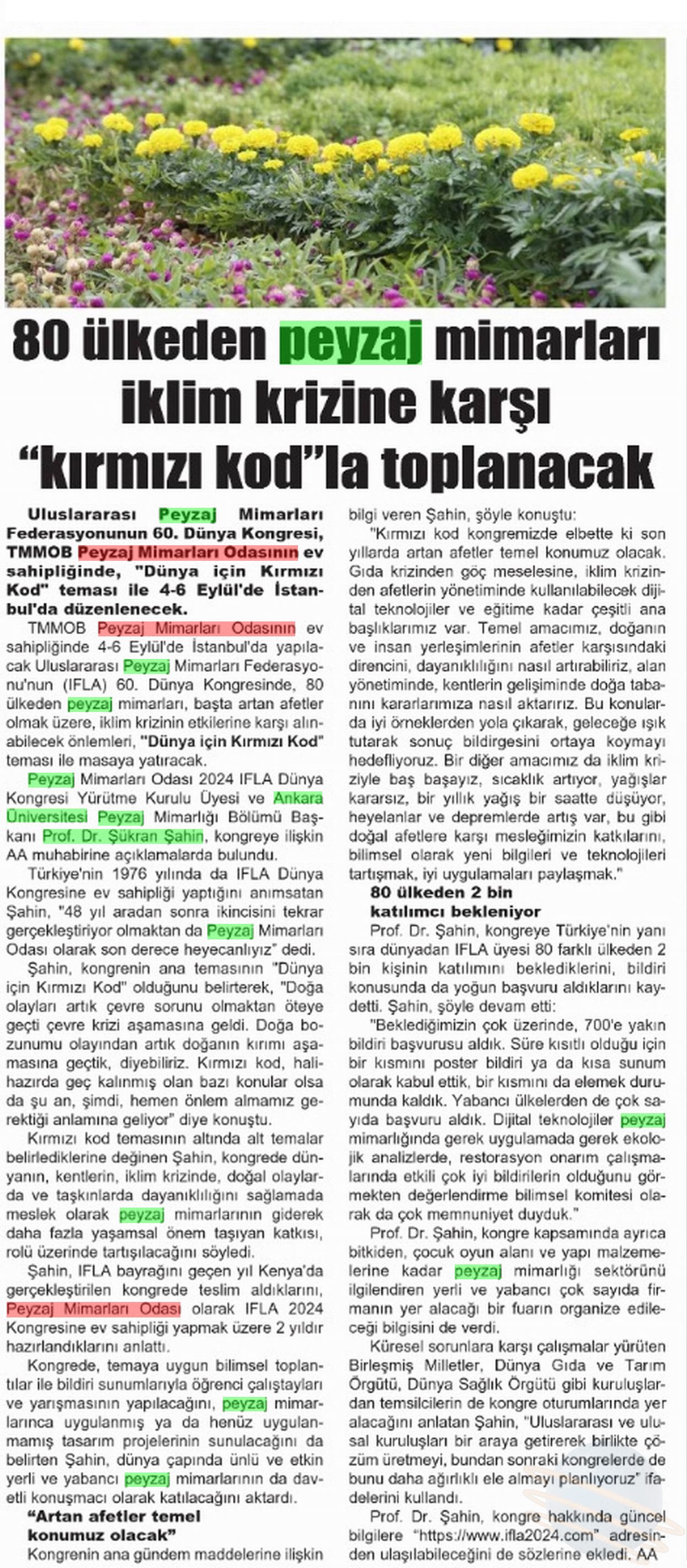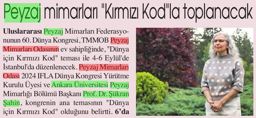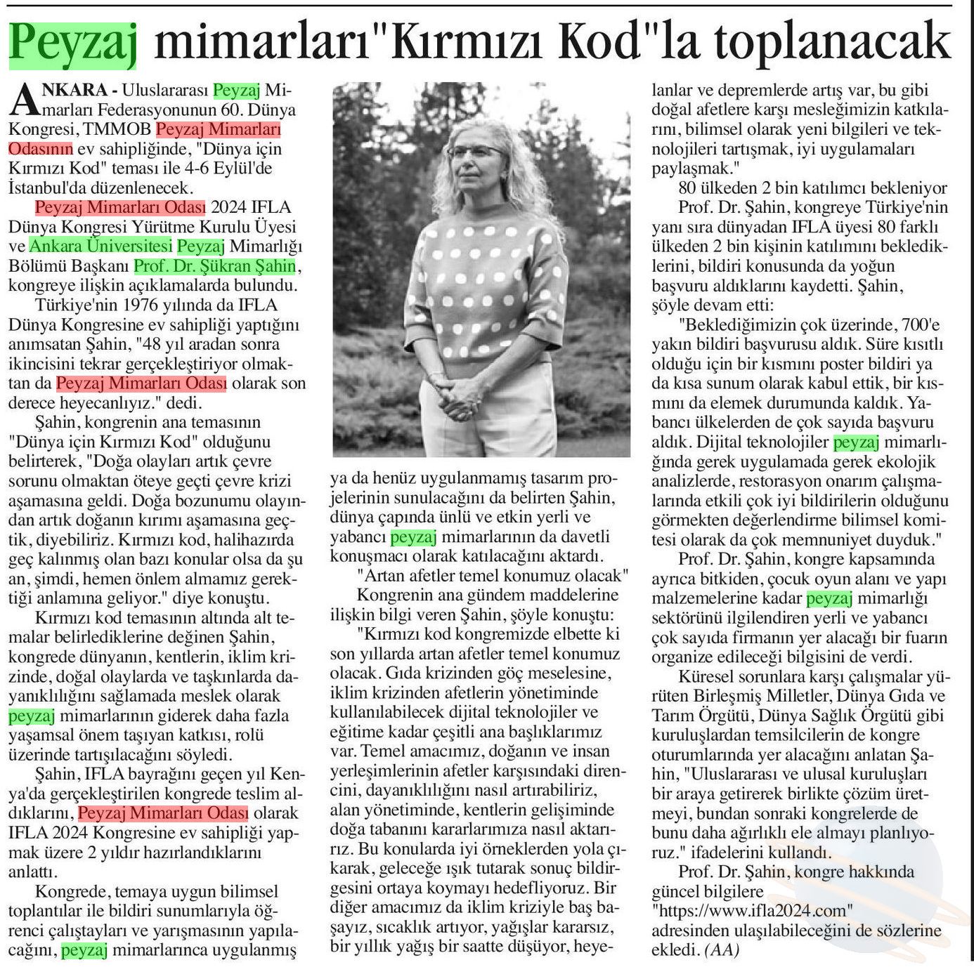 IFLA 2024 Dünya Kongresi basında geniş yer aldı. Peyzaj Mimarları Odası 2024 IFLA Dünya Kongresi Yürütme Kurulu Üyesi ve Ankara Üniversitesi Peyzaj Mimarlığı Bölümü Başkanı Prof. Dr. Şükran Şahin, kongreye ilişkin AA muhabirine açıklamalarda bulundu.