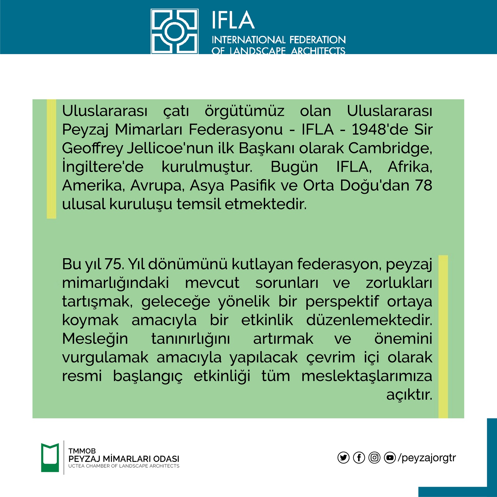 Uluslararası çatı örgütümüz olan Uluslararası Peyzaj Mimarları Federasyonu - IFLA - 1948de Sir Geoffrey Jellicoenun ilk Başkanı olarak Cambridge, İngilterede kurulmuştur. Bugün IFLA, Afrika, Amerika, Avrupa, Asya Pasifik ve Orta Doğudan 78 ulusal kuruluşu temsil etmektedir.