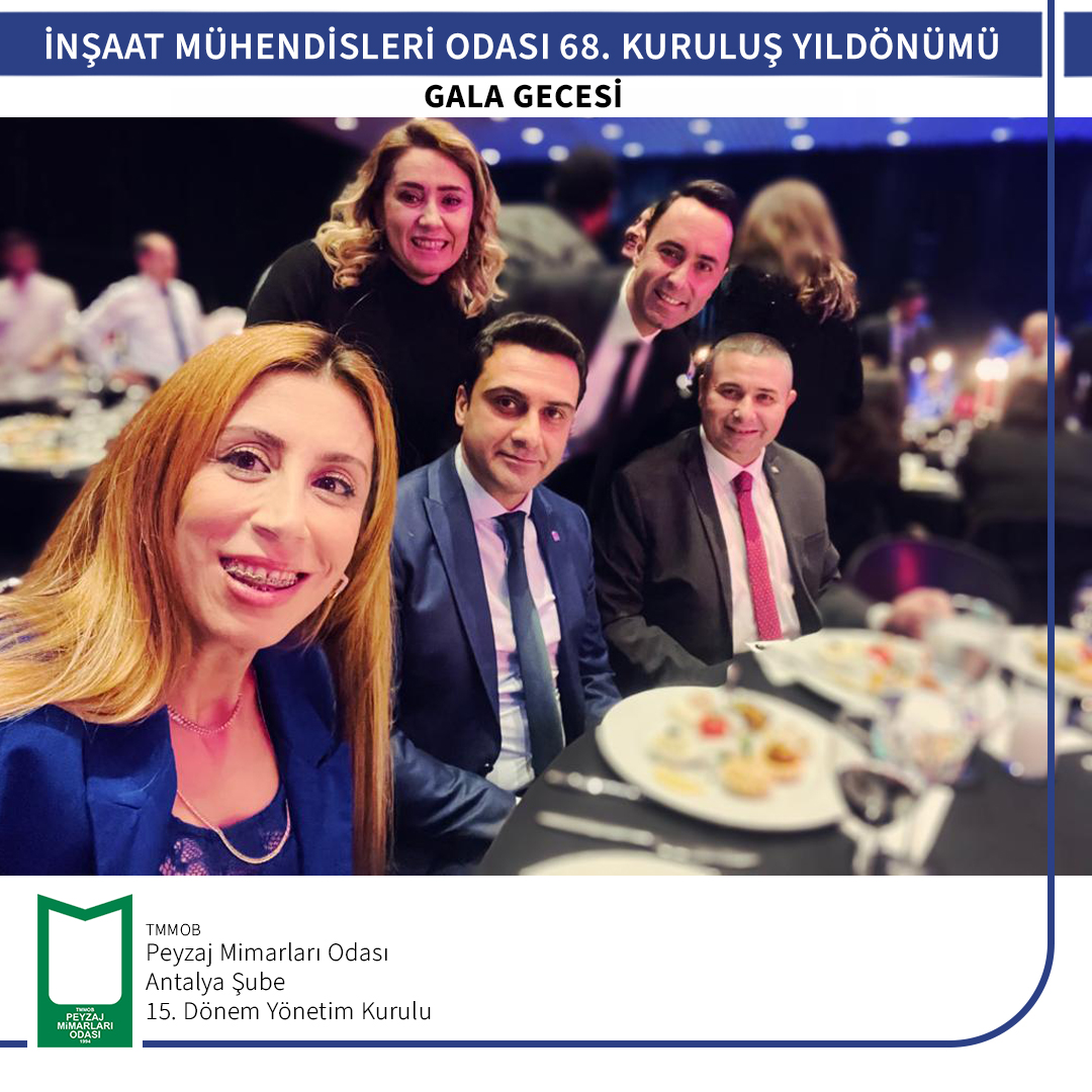 TMMOB İnşaat Mühendisleri Odası Antalya Şubesi tarafından 18 Aralık 2022 tarihinde düzenlenmiş olan, 68. Kuruluş Yıldönümü Gala Gecesi`ne şubemizi temsilen Şube Başkanı Gülsüm KILDAN katılım sağlamıştır.