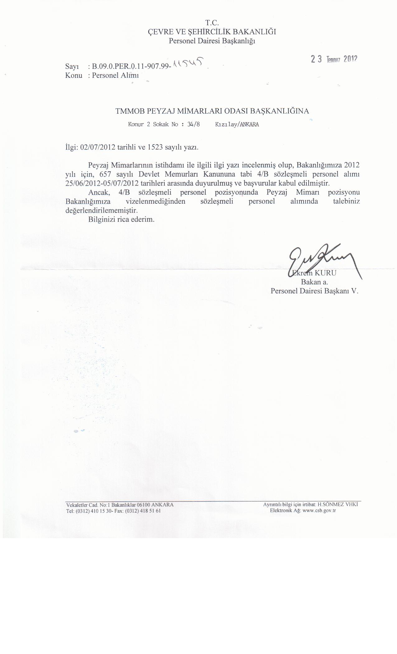 Peyzaj mimarlığı uzmanlık alanları içerisinde en fazla görev ve sorumluluk alan tanımı olan ve personel kadrolarında en fazla peyzaj mimarı istihdam edilmesinin kamu yararı anlamında değerli olduğu her iki bakanlığımıza yapmış olduğumuz başvurularımıza; Orman ve Su İşleri Bakanlığı, " peyzaj mimarı alımı hakkında ilgi yazınız incelenmiş olup, bakanlığımız emrine gerek bu yıl gerekse bundan sonraki yıllarda yapılacak olan atamalarda talebiniz değerlendirmeye çalışılacaktır." Çevre ve Şehircilik Bakanlığı ise, " peyzaj mimarı istihdamı talepli yazını incelenmiş olup, bakanlığımıza 2012 yılı için, 657 sayılı Devlet Memurları Kanununa tabi 4/B sözleşmeli personel alımı 25.06.2012 - 05.07.2012 tarihleri arasında duyurulmuş ve başvurular kabul edilmiştir. Ancak 4/B sözleşmeli personel pozisyonu Bakanlığımıza vizelenmediğinden sözleşmeli personel alımında talebiniz değerlendirilememiştir." Şeklinde yanıt alınmıştır.