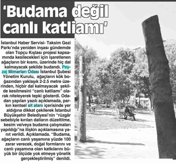 Bir kültür varlığı olma niteliğinde tarihi kentsel peyzajımız olan bu alandaki işaretlenmiş ağaçlardan bazılarının ise 19.07.2012 tarihinde kök boğazından yaklaşık 2-2,5 m üzerinden, hiçbir dal kalmayacak şekilde kesildiği tespit edilmiştir. T.C. Kültür Bakanlığı İstanbul I Numaralı Kültür ve Tabiat Varlıklarını Koruma Kurulu‘nun 07.07.1993 tarih 4750 sayılı belirlenen Kentsel Sit Alanı içerisinde yer alan Taksim Gezisi‘ndeki ağaç kesme çalışmaları kısmi budama değil, birer "CANLI KATLİAMI"dır.
