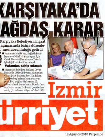 Karşıyaka‘da "Sağlıklı Kentleşme ve nitelikli yapılaşma için ortak mesleki denetim ve teknik işbirliği protokolü" Belediye Başkanı Cevat Durak ile TMMOB Peyzaj Mimarları Odası Şube Başkanı Prof. Dr. Erhan Küçükerbaş arasında imzalandı. Kent estetiğinin sadece belediyelerin yaptığı düzenlemeler olmadığını belirten Durak, "Vatandaşlarımızın bahçelerine, balkonlarına sahip çıkmalarını, yaşadıkları alanları güzelleştirmelerini istiyoruz. Bu uygulama ile özellikle yanlış ağaç dikimi ile sonrasında yaşanan sıkıntılar önlenirken, müteahhitlerin bahçe düzenlemelerini yapmadan ayrılması önlenecek" dedi. İnşaat ruhsatı aşamasında apartman bahçe alanı 200 metrekare den büyükse inşaatı yapacak olandan bahçe için projede istenecek. Bahçe alanı 200 metrekare den daha küçük ise proje yerine bahçe düzenlemesi istenecek. Küçük bahçeleri düzenleyecek olanlara Karşıyaka Park ve Bahçeler Müdürlüğü ile Peyzaj Mimarları Odası gönüllü danışmanlık hizmeti verecek. Bahçe düzenlemesi yapmayana oturma raporu verilmeyecek. HÜRRİYET İZMİR EGE 19.07.2010