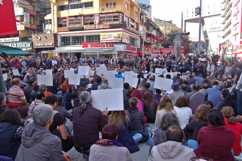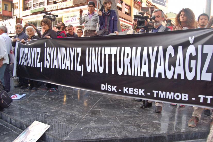 Ankara`da Sakarya Meydanı`nda DİSK, KESK, TMMOB ve TTB`nin çağrısıyla toplanan yüzlerce kişi katliamın gerçekleştiği saat 10.04`te saygı duruşuyla hayatını yitirenleri andı. Saygı duruşunun ardından gerçekleştirilen oturma eyleminde tek tek hayatını kaybedenlerin isimleri okunurken, katılımcıların "Burada" haykırışlarıyla, yaşamını yitirenlerin isimlerinin yazıldığı siyah pankartlarla ve dakikalarca süren alkış eylemiyle ölenler anıldı.