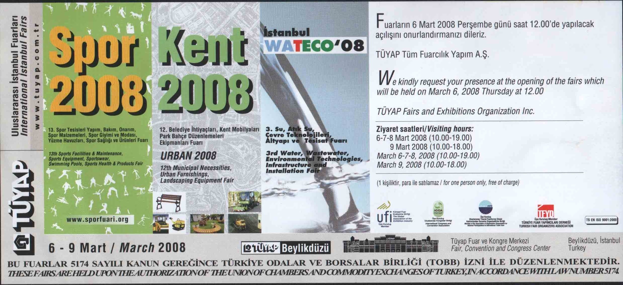 Tüyap Fuar ve Kongre Merkezinde Kent 2008 12. Belediye İhtiyaçları, Kent Mobilyaları Park Bahçe Düzenlemeleri Ekipmanları Fuarı 6-9 Mart 2008 tarihlerinde gerçekleştirilecektir.