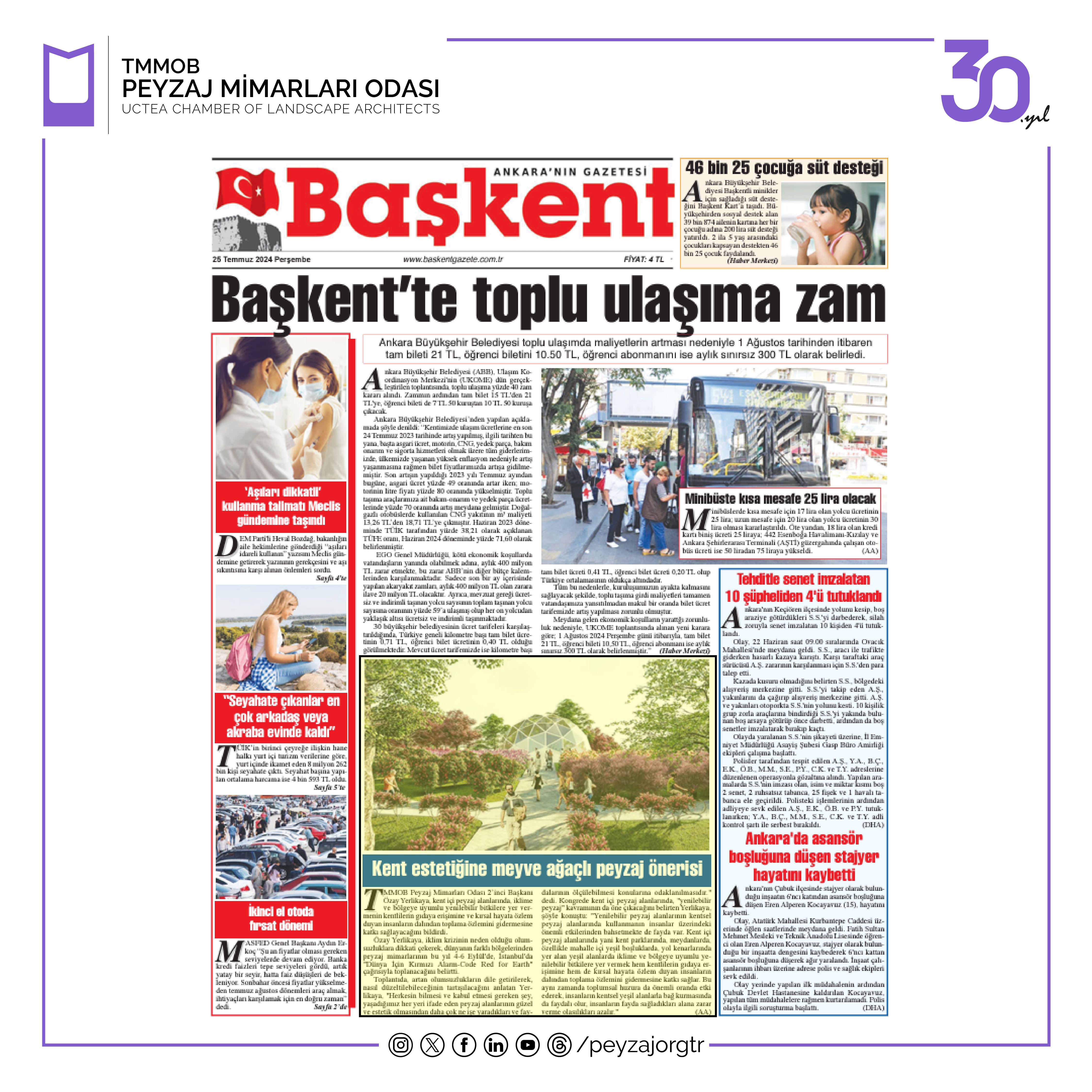 Odamız 2. Başkanı Özay Yerlikaya, Anadolu Ajans’ından Yıldız Nevin Kasım ile 4-6 Eylül 2024 tarihleri arasında İstanbul’da gerçekleştirilecek olan 60. IFLA Dünya Kongresi, iklim değişikliği ve yenebilir peyzajlar ile ilgili yaptığı röportaj basında geniş yer bulmuştur.