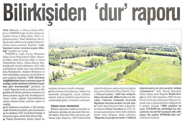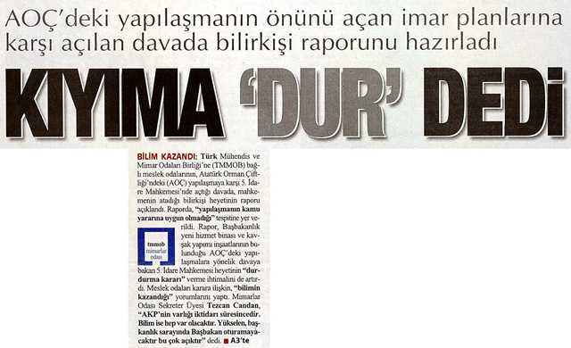 AOÇ‘deki yapılaşmanın önünü açan imar planlarına karşı açılan davada bilirkişi raporunu hazırladı BİLİM KAZANDI: Türk Mühendis ve Mimar Odaları Birliği‘ne (TMMOB) bağlı meslek odalarının, Atatürk Orman Çiftliği‘ndeki (AOÇ) yapılaşmaya karşı 5. idare Mahkemesi‘nde açtığı davada, mahkemenin atadığı bilirkişi heyetinin raporu açıklandı. Raporda, "yapılaşmanın kamu yararına uygun olmadığı" tespitine yer verildi. Rapor, Başbakanlık yeni hizmet binası ve kavşak yapımı inşaatlarının bulunduğu AOÇ‘deki yapılaşmalara yönelik davaya bakan 5. İdare Mahkemesi heyetinin "durdurma karan" verme ihtimalini de artırdı. Meslek odaları karara ilişkin, "bilimin kazandığı" yorumlarını yaptı. Mimarlar Odası Sekreter Üyesi Tezcan Candan, "AKP‘nin varlığı iktidarı süresincedir. Bilim ise hep var olacaktır. Yükselen, başkanlık sarayında Başbakan oturamayâcaktır bu çok açıktır" dedi.