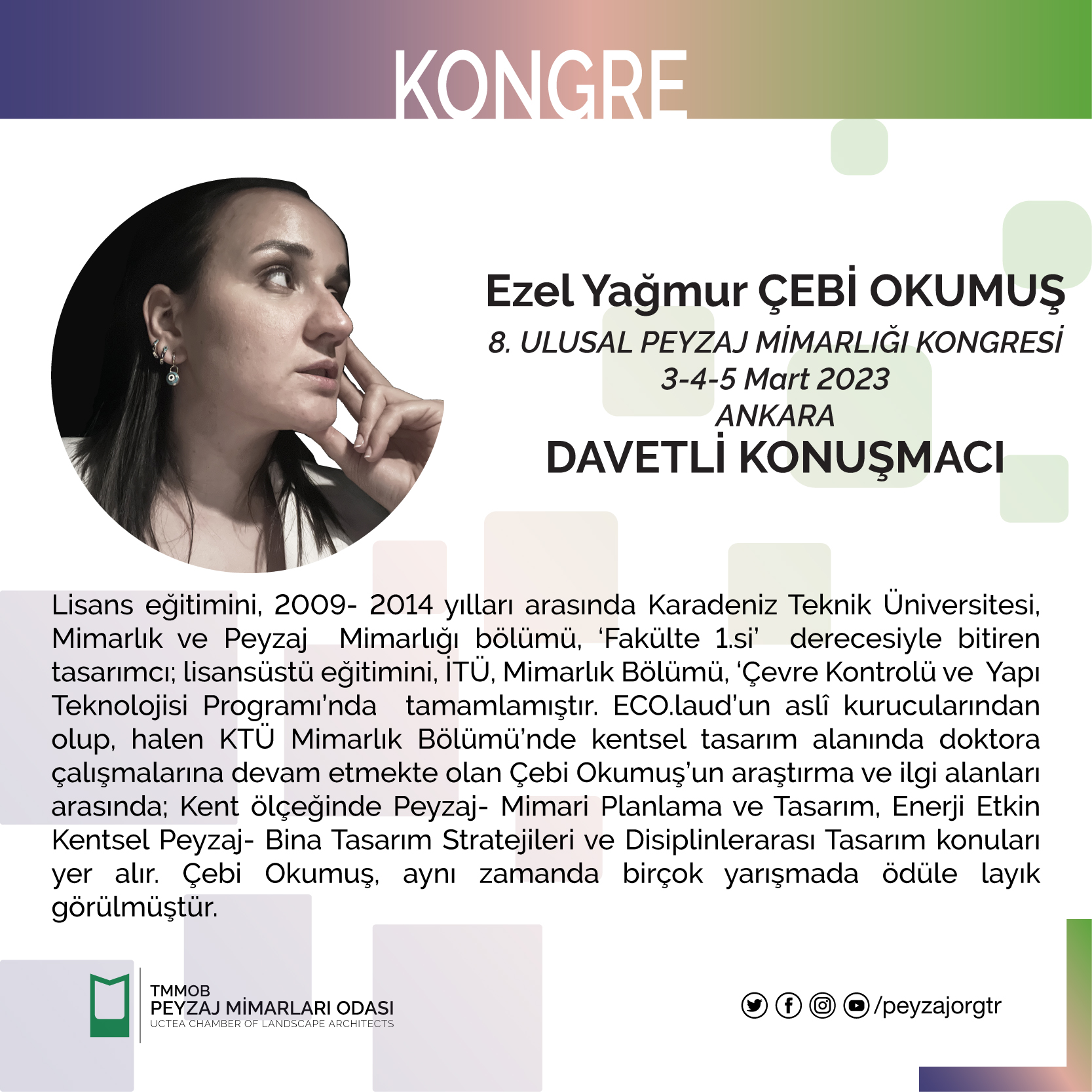 Birçok yarışmada ödüle layık görülen Cemil Hamdi ve Ezel Yağmur ÇEBİ OKUMUŞ çifti, 3-4-5 Mart 2023 tarihinde Ankara`da gerçekleştirilecek olan Peyzaj ve Kent temalı 8. Ulusal Peyzaj Mimarlığı Kongresi`nde davetli konuşmacı olarak yer alacaktır.