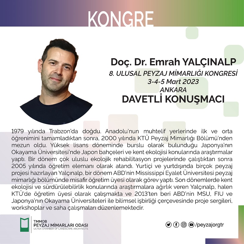 Karadeniz Teknik Üniversitesi`nde verdiği derslerin yanı sıra Türkiye ve dünyanın farklı ülkelerinde projeler geliştiren Doç. Dr. Emrah YALÇINALP, 3-4-5 Mart 2023 tarihinde Ankara`da gerçekleştirilecek olan Peyzaj ve Kent temalı 8. Ulusal Peyzaj Mimarlığı Kongresi`nde davetli konuşmacı olarak yer alacaktır.