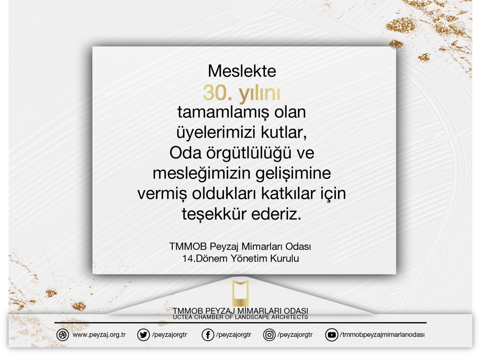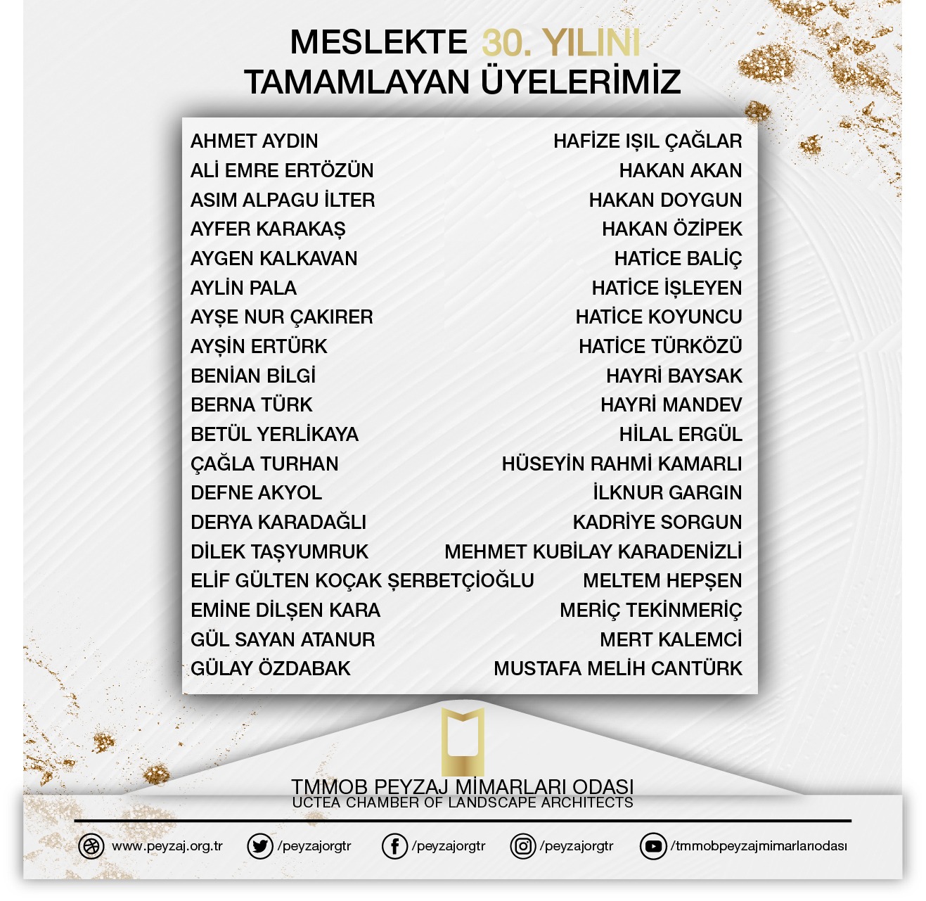 Meslekte 30. yılını tamamlamış olan üyelerimizi kutlar, Oda örgütlülüğü ve mesleğimizin gelişimine vermiş oldukları katkılar için teşekkür ederiz.