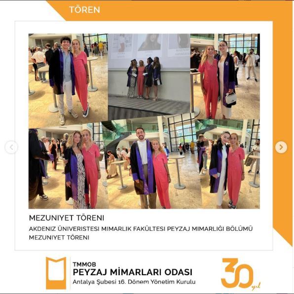 2 Temmuz 2024 tarihi saat 13:00’de gerçekleşen Akdeniz Üniversitesi Mimarlık Fakültesi Peyzaj MimarlığI Bölümü 4. Sınıf öğrencilerinin Mezuniyet Töreni’ne Gülsüm KILDAN, Canay IŞIKLI ve Ümit YİĞİT’in katılmıştır. Mezuniyet Töreninde 2024 dönemi mezunları arasında 1.2.ve 3. olan öğrencilere Başkan Gülsüm Kıldan ücretsiz kayıt belgelerini takdim etmiş ve aramıza hoşgeldiniz konuşması gerçekleştirmiştir.Yeni mezun tüm meslektaşlarımıza meslek hayatlarında başarılar dileriz.