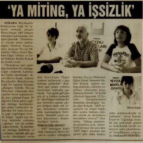Ankara Büyükşehir Belediyesi’ne bağlı bir taşeron firmada çalıştığı sırada, Adalet ve Kalkınma Partisi’nin düzenlediği Ankara mitinge katılmadığı gerekçesiyle işten çıkarılan Üyemiz Sn. Merve ERŞAN'a, TMMOB Peyzaj Mimarları Odası Genel Başkanı Sn. Oğuz YILMAZ ve Oda Genel Sekreteri Sn. Redife KOLÇAK destek verdi.