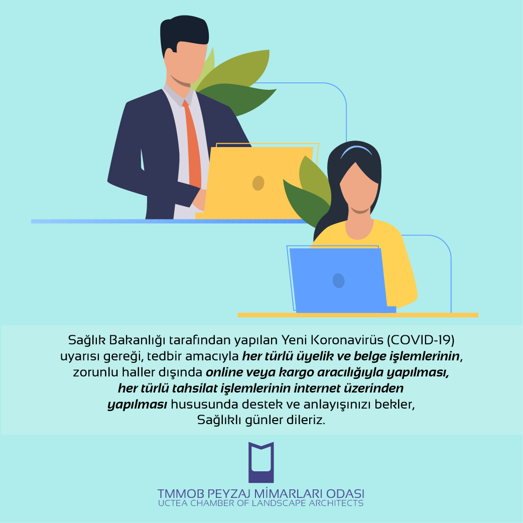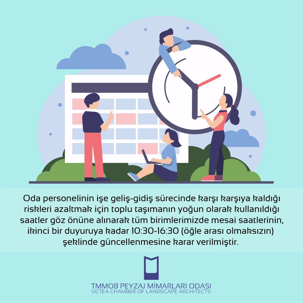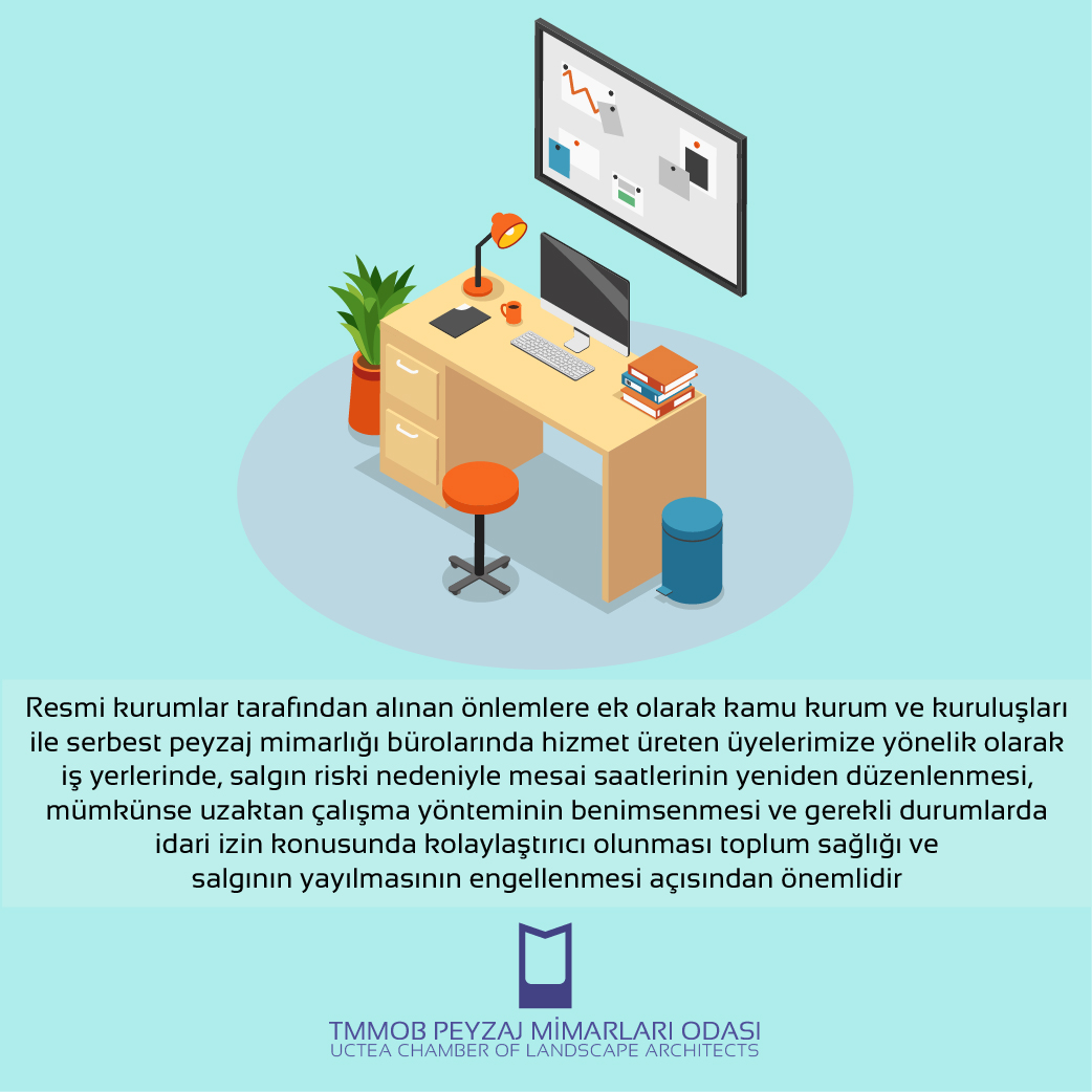 Resmi kurumlar tarafından alınan önlemlere ek olarak kamu kurum ve kuruluşları ile serbest peyzaj mimarlığı bürolarında hizmet üreten üyelerimize yönelik olarak iş yerlerinde, salgın riski nedeniyle mesai saatlerinin yeniden düzenlenmesi, mümkünse uzaktan çalışma yönteminin benimsenmesi ve gerekli durumlarda idari izin konusunda kolaylaştırıcı olunması toplum sağlığı ve salgının yayılmasının engellenmesi açısından önemlidir.