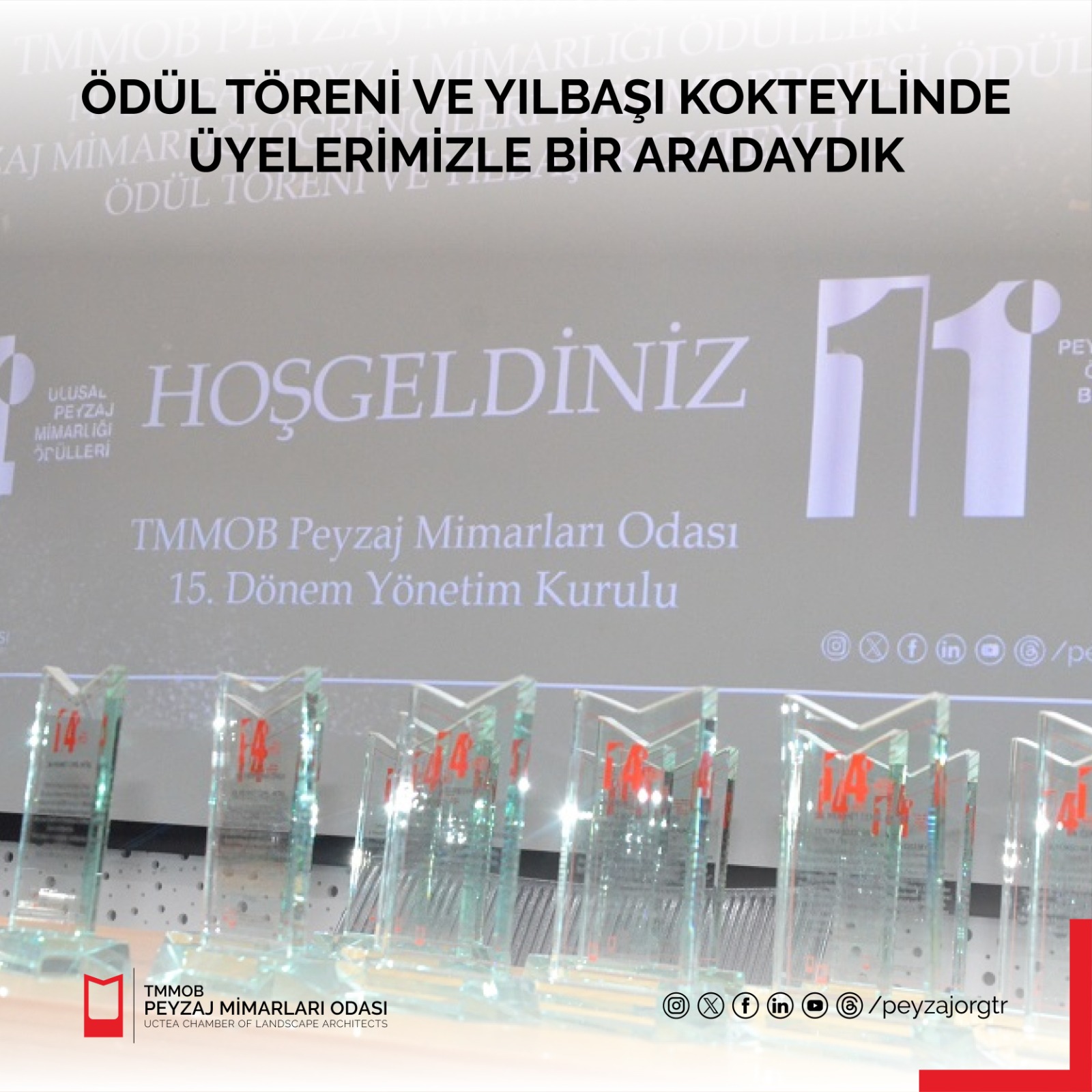 8 Aralık 2023 Cuma günü TMMOB Mimarlar Odası`nda düzenlenen 14. Ulusal Peyzaj Mimarlığı Ödülleri ve 11. Peyzaj Mimarlığı Bölümü Öğrencileri Bitirme Projesi Ödülleri Ödül Töreni ve 2024 yılı Yılbaşı Kokteylinde üyelerimizle bir araya gelinmiştir.