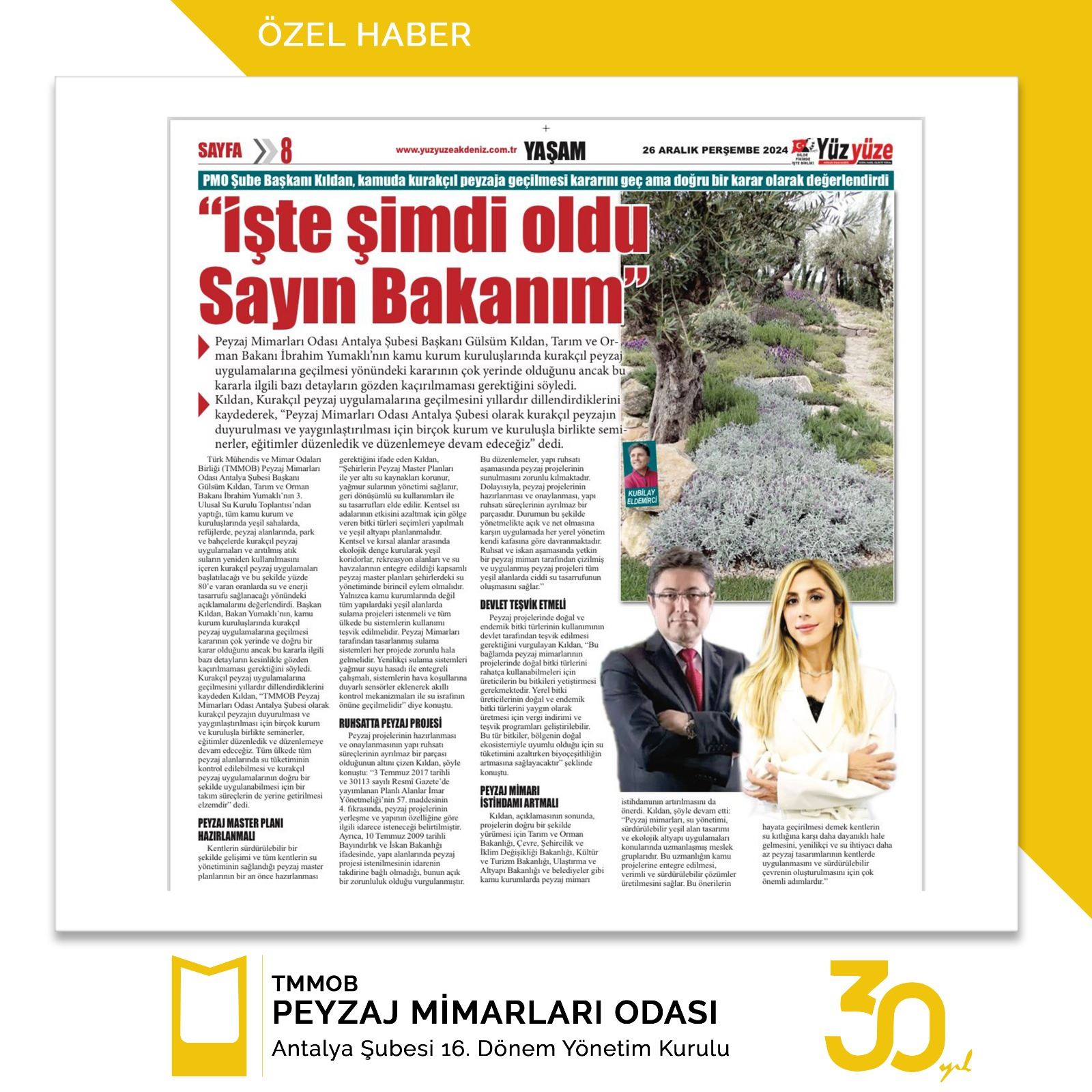 Türk Mühendis ve Mimar Odaları Birliği (TMMOB) Peyzaj Mimarları Odası Antalya Şubesi Başkanı Gülsüm Kıldan, Tarım ve Orman Bakanı İbrahim Yumaklı’nın 3. Ulusal Su Kurulu Toplantısı’ndan yaptığı, tüm kamu kurum ve kuruluşlarında yeşil sahalarda, refüjlerde, peyzaj alanlarında, park ve bahçelerde kurakçıl peyzaj uygulamaları ve arıtılmış atık suların yeniden kullanılmasını içeren kurakçıl peyzaj uygulamaları başlatılacağı ve bu şekilde yüzde 80’e varan oranlarda su ve enerji tasarrufu sağlanacağı yönündeki açıklamalarını değerlendirdi. Başkan Kıldan, Bakan Yumaklı’nın, kamu kurum kuruluşlarında kurakçıl peyzaj uygulamalarına geçilmesi kararının çok yerinde ve doğru bir karar olduğunu ancak bu kararla ilgili bazı detayların kesinlikle gözden kaçırılmaması gerektiğini söyledi. Kurakçıl peyzaj uygulamalarına geçilmesini yıllardır dillendirdiklerini kaydeden Kıldan, “TMMOB Peyzaj Mimarları Odası Antalya Şubesi olarak kurakçıl peyzajın duyurulması ve yaygınlaştırılması için birçok kurum ve kuruluşla birlikte seminerler, eğitimler düzenledik ve düzenlemeye devam edeceğiz. Tüm ülkede tüm peyzaj alanlarında su tüketiminin kontrol edilebilmesi ve kurakçıl peyzaj uygulamalarının doğru bir şekilde uygulanabilmesi için bir takım süreçlerin de yerine getirilmesi elzemdir” dedi.