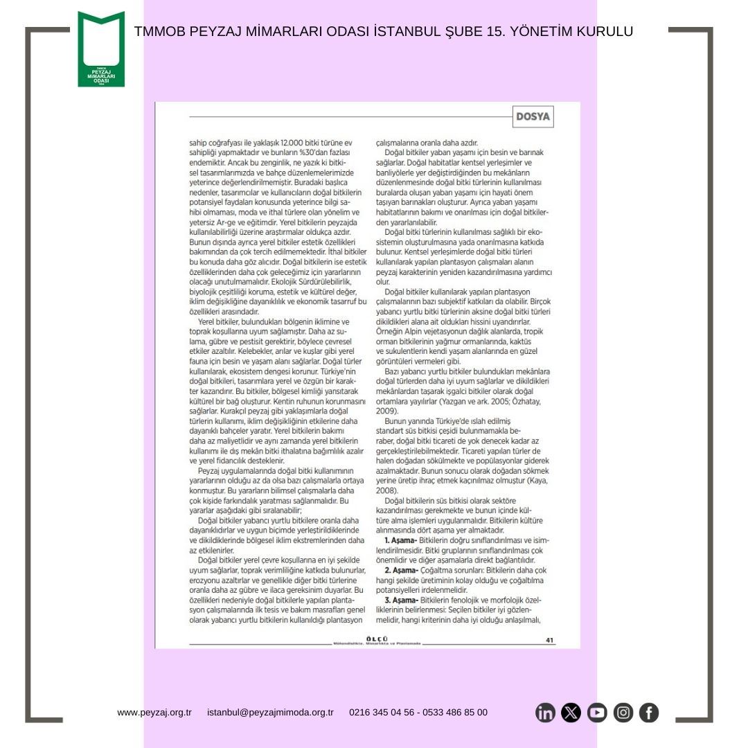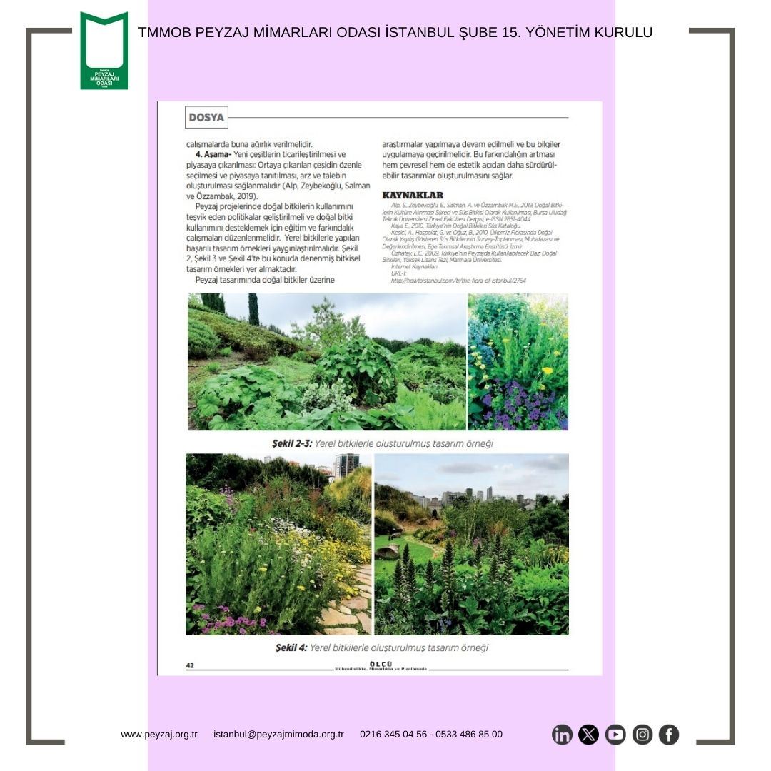 Dergide Şubemiz Yönetim Kurulu Üyelerimizden Peyzaj Yüksek Mimarı Sn. Nihan Sevinç MUŞDAL`ın, “KENTSEL YEŞIL ALANLARDA DOĞAL BİTKİLERİN ROLÜ: Doğaya Dönüş” konulu yazısı da yer almıştır.
