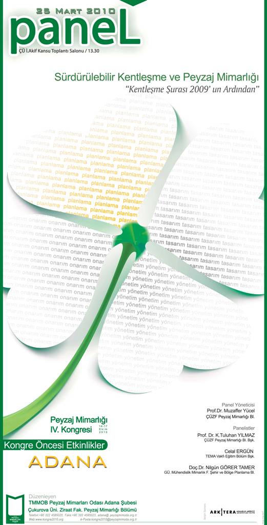 Peyzaj Mimarlığı 4. Kongresi / Kongre Öncesi Etkinlikler kapsamında Adana' da Adana Şubemiz tarafından düzenlenecek olan Panel 25 Mart 2010 tarihinde ÇÜ İ.Akif Kansu Salonu'nda gerçekleştiriliyor... Etkinliğin saati 13:30