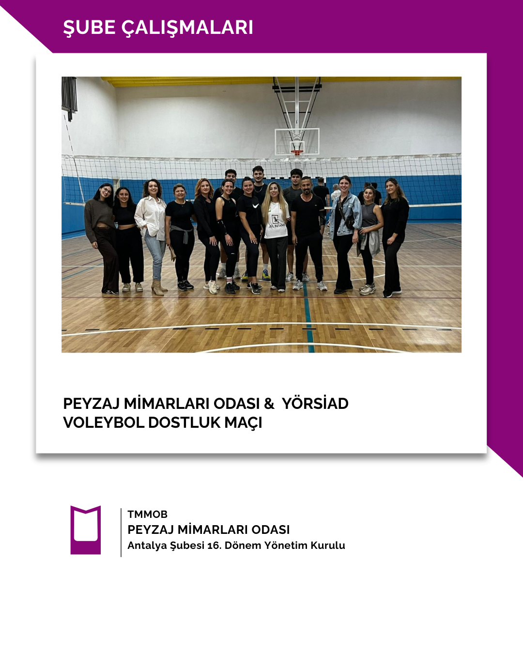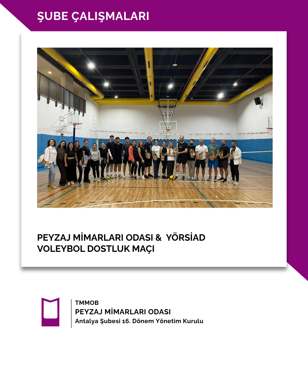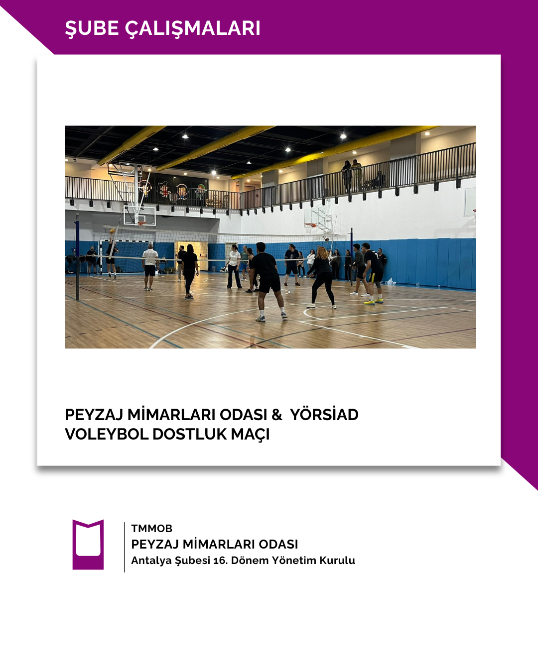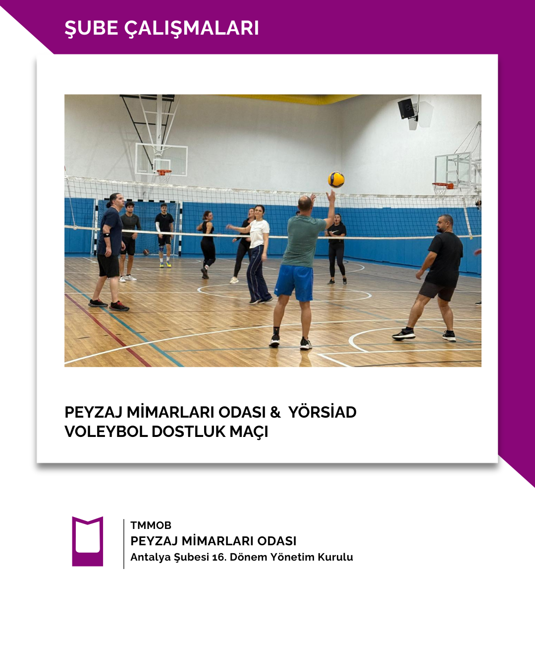 13 Kasım 2025 tarihinde Peyzaj Mimarları Odası ile YÖRSİAD (Yörük Sanayici ve İş İnsanları Derneği takımları arasında voleybol dostluk maçı karşılaşması gerçekleştirilmiştir.