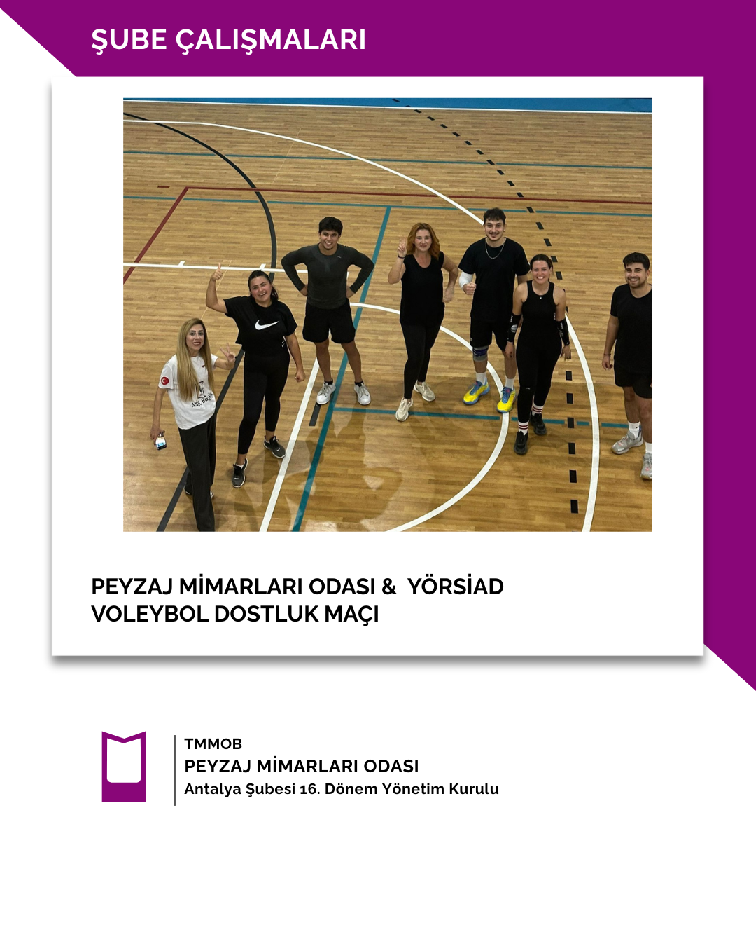 Peyzaj Mimarları Odası Antalya Şubesi olarak kurduğumuz Voleybol Takımımızı ilk maçında aldığı zaferden dolayı da tebrik eder, başarılarının devamını dileriz.
