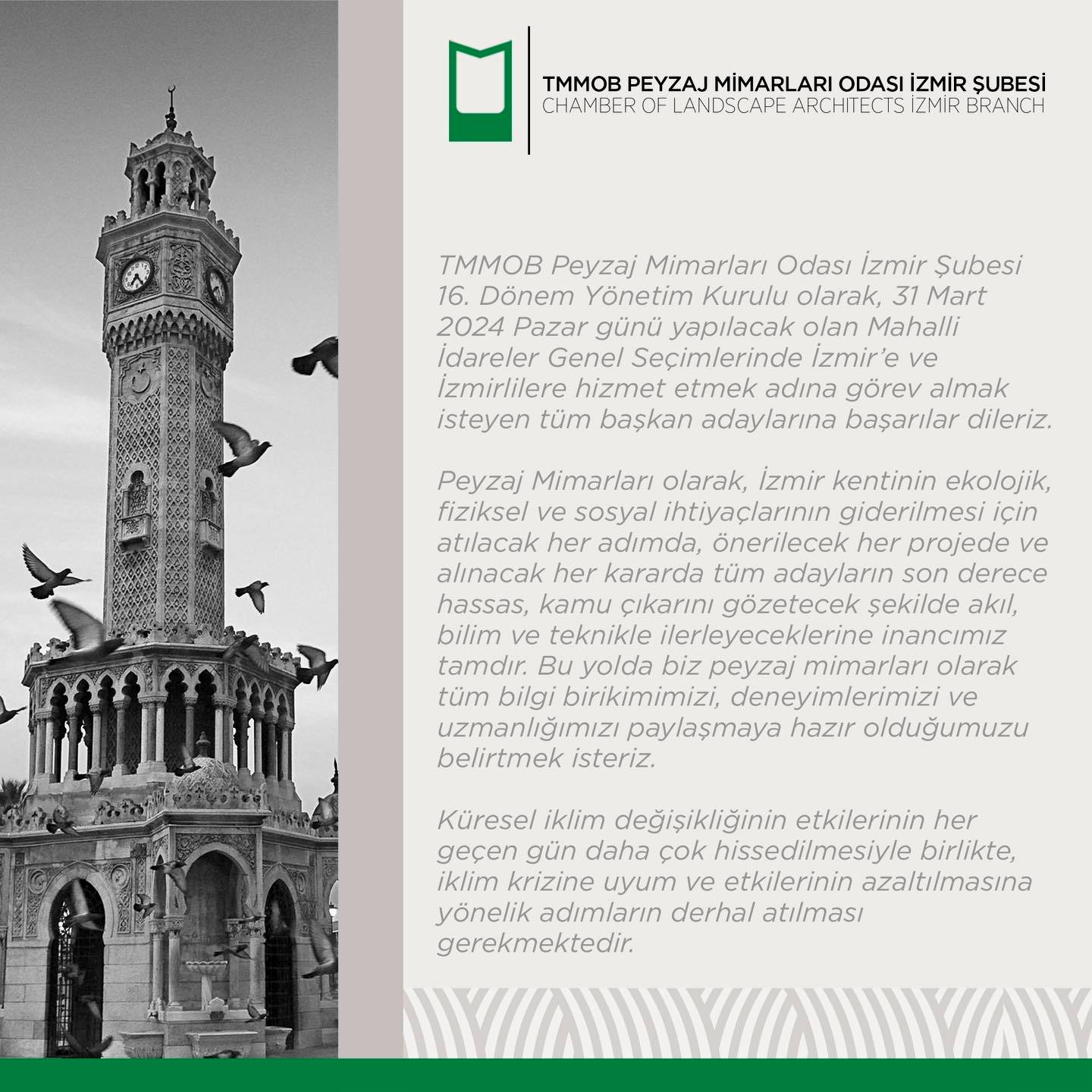 TMMOB Peyzaj Mimarları Odası İzmir Şubesi 16. Dönem Yönetim Kurulu olarak, 31 Mart 2024 Pazar günü yapılacak olan Mahalli İdareler Genel Seçimlerinde İzmir’e ve İzmirlilere hizmet etmek adına görev almak isteyen tüm başkan adaylarına başarılar dileriz.