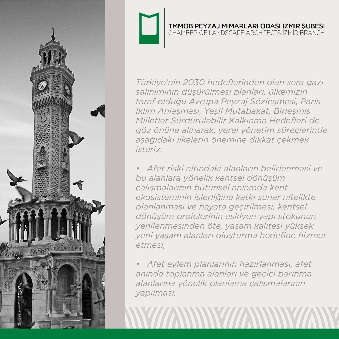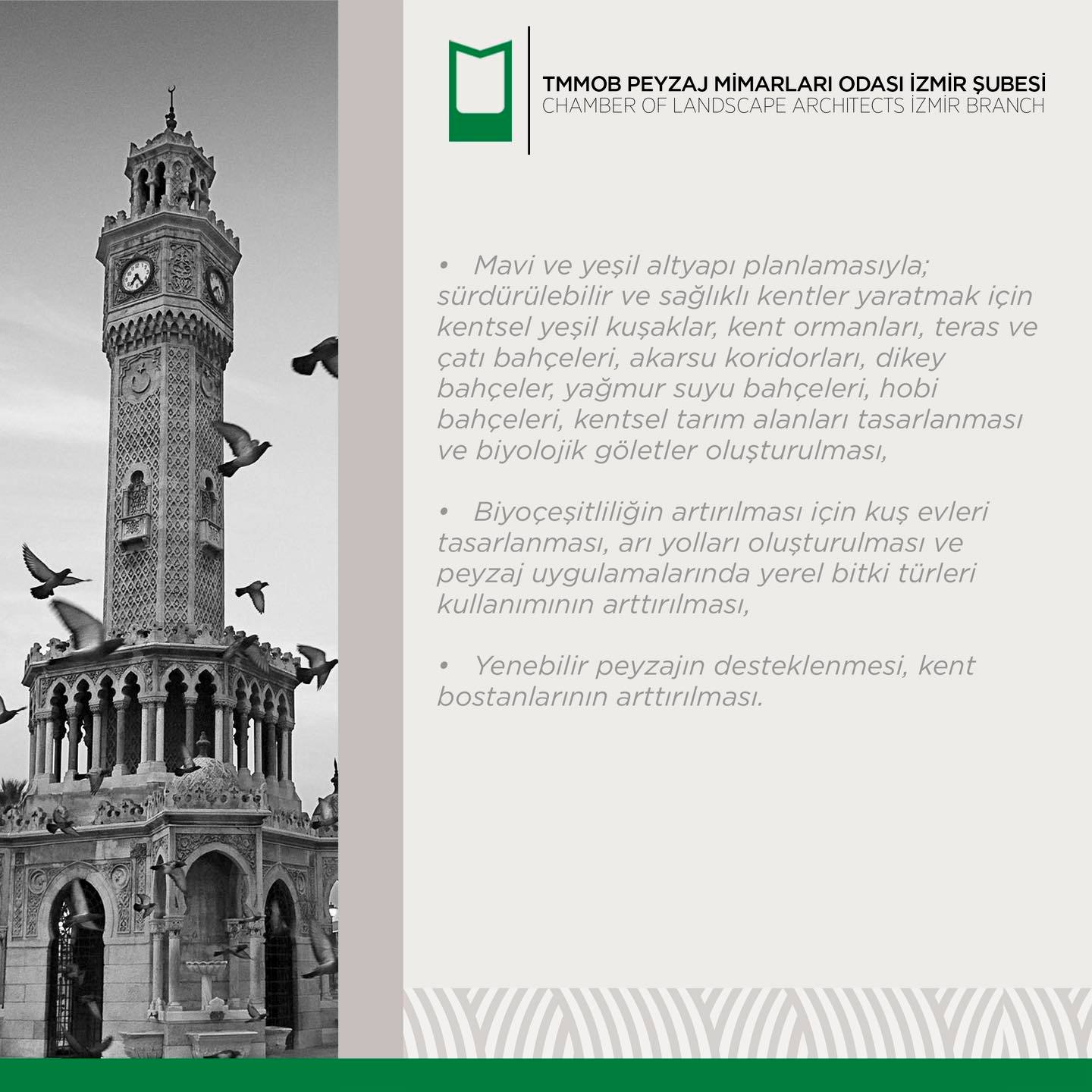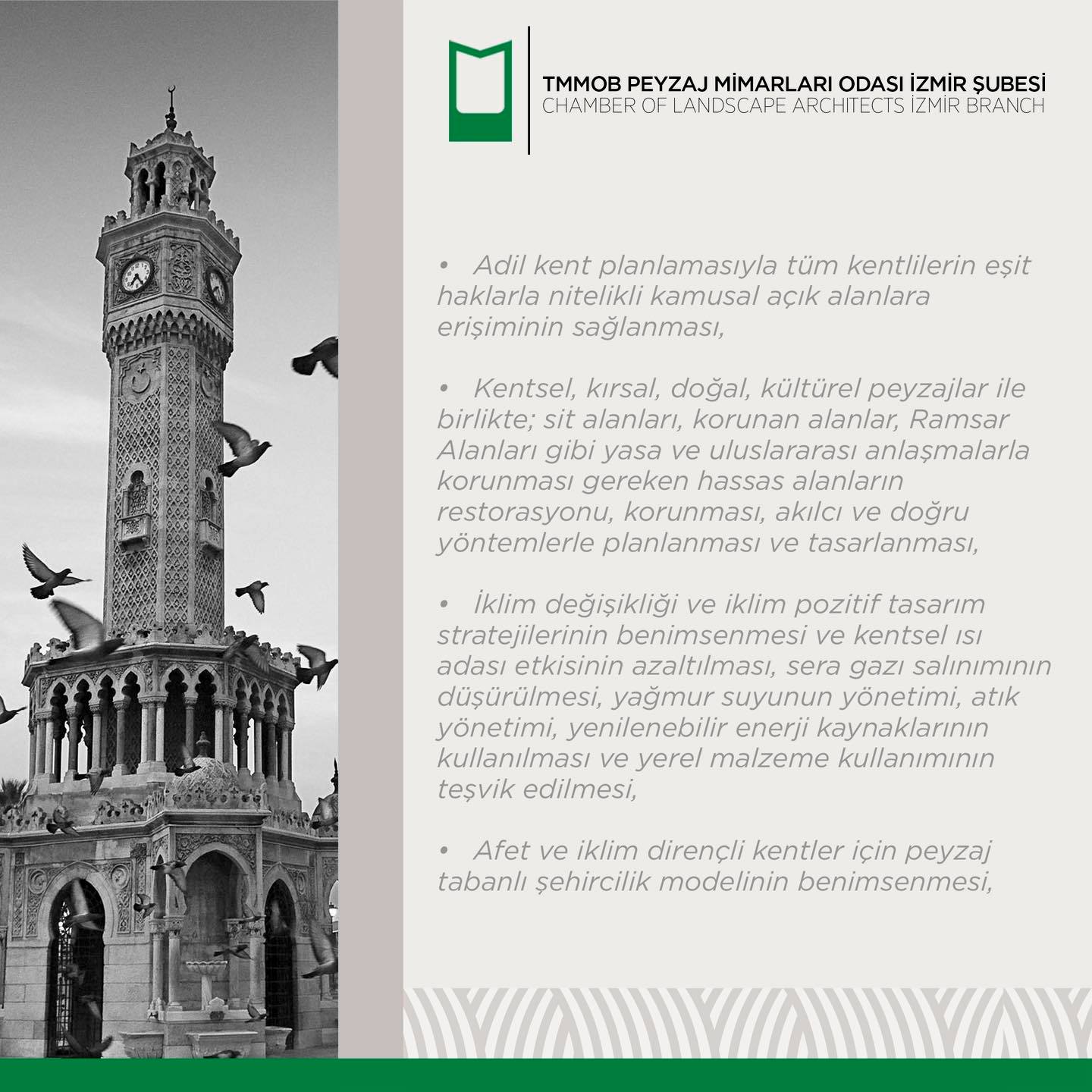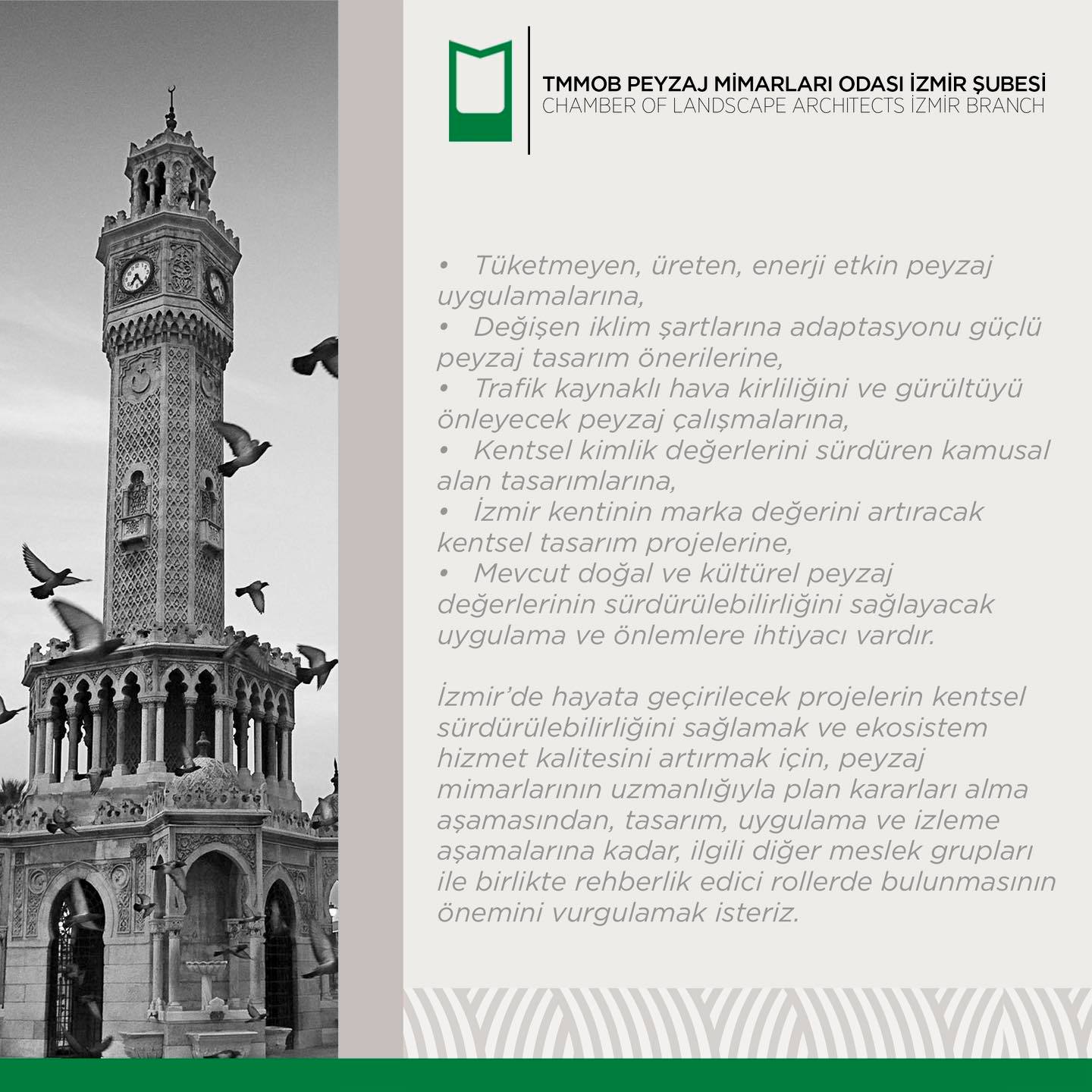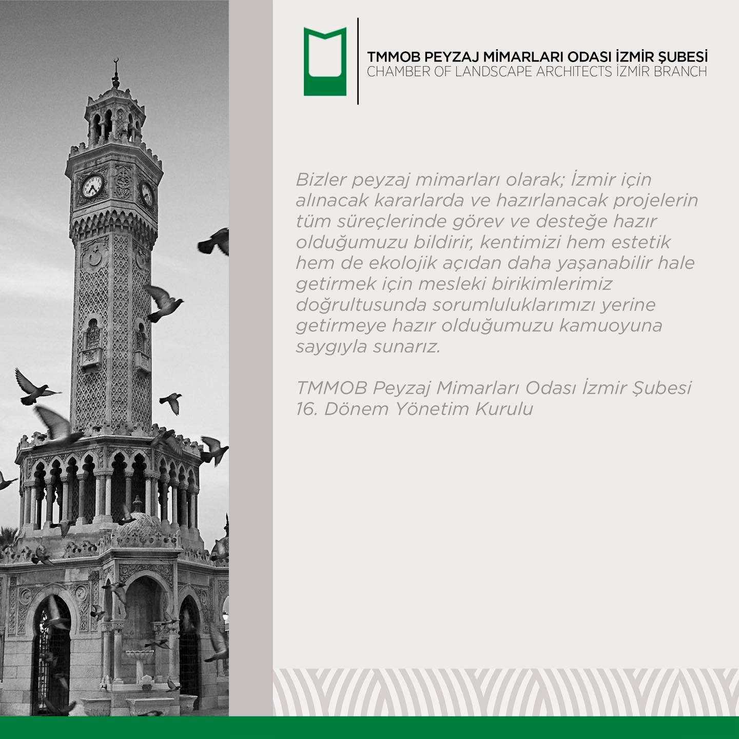 Bizler peyzaj mimarları olarak; İzmir için alınacak kararlarda ve hazırlanacak projelerin tüm süreçlerinde görev ve desteğe hazır olduğumuzu bildirir, kentimizi hem estetik hem de ekolojik açıdan daha yaşanabilir hale getirmek için mesleki birikimlerimiz doğrultusunda sorumluluklarımızı yerine getirmeye hazır olduğumuzu kamuoyuna saygıyla sunarız.