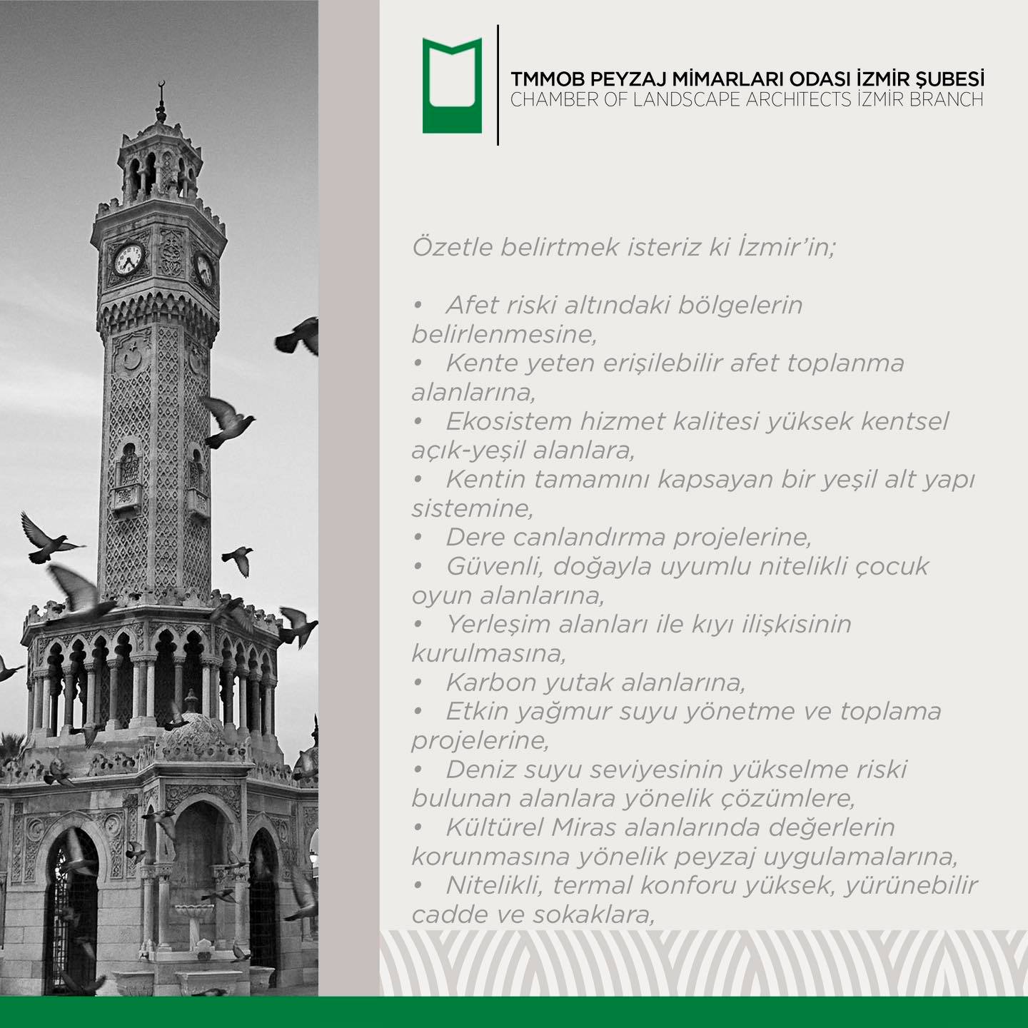 Peyzaj Mimarları olarak, İzmir kentinin ekolojik, fiziksel ve sosyal ihtiyaçlarının giderilmesi için atılacak her adımda, önerilecek her projede ve alınacak her kararda tüm adayların son derece hassas, kamu çıkarını gözetecek şekilde akıl, bilim ve teknikle ilerleyeceklerine inancımız tamdır. Bu yolda biz peyzaj mimarları olarak tüm bilgi birikimimizi, deneyimlerimizi ve uzmanlığımızı paylaşmaya hazır olduğumuzu belirtmek isteriz.