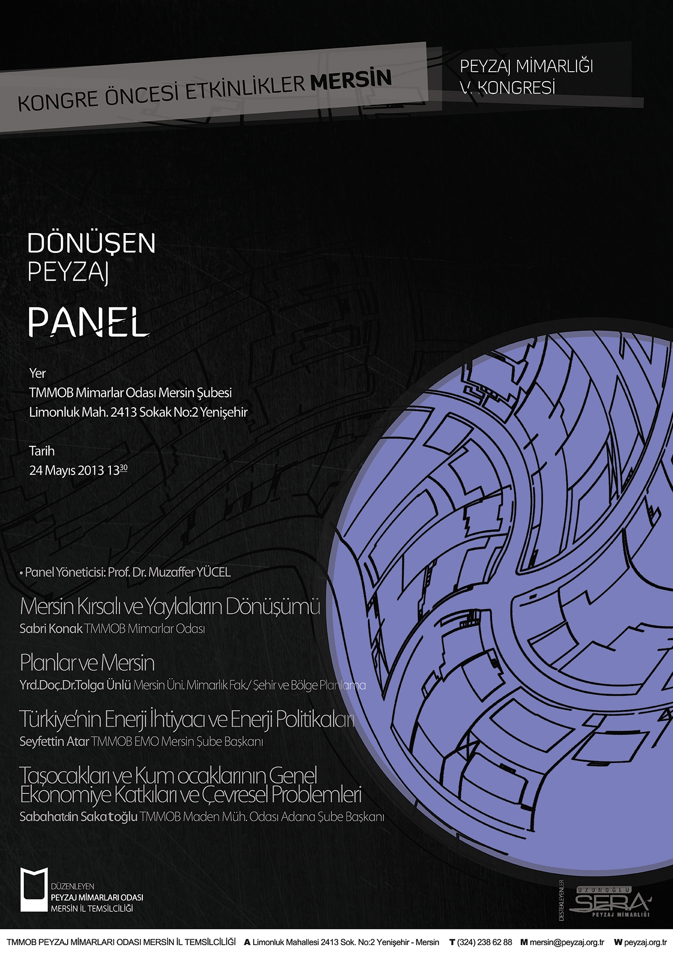 TMMOB Peyzaj Mimarları Odası olarak, 14 - 17 Kasım 2013 tarihleri arasında Adana‘da düzenlenecek 5. Peyzaj Mimarlığı Kongresi/Kongre öncesi etkinlikler kapsamında Mersin‘de Mersin İl Temsilciliğimiz tarafından 24 Mayıs 2013 Cuma Günü panel düzenlenecektir.