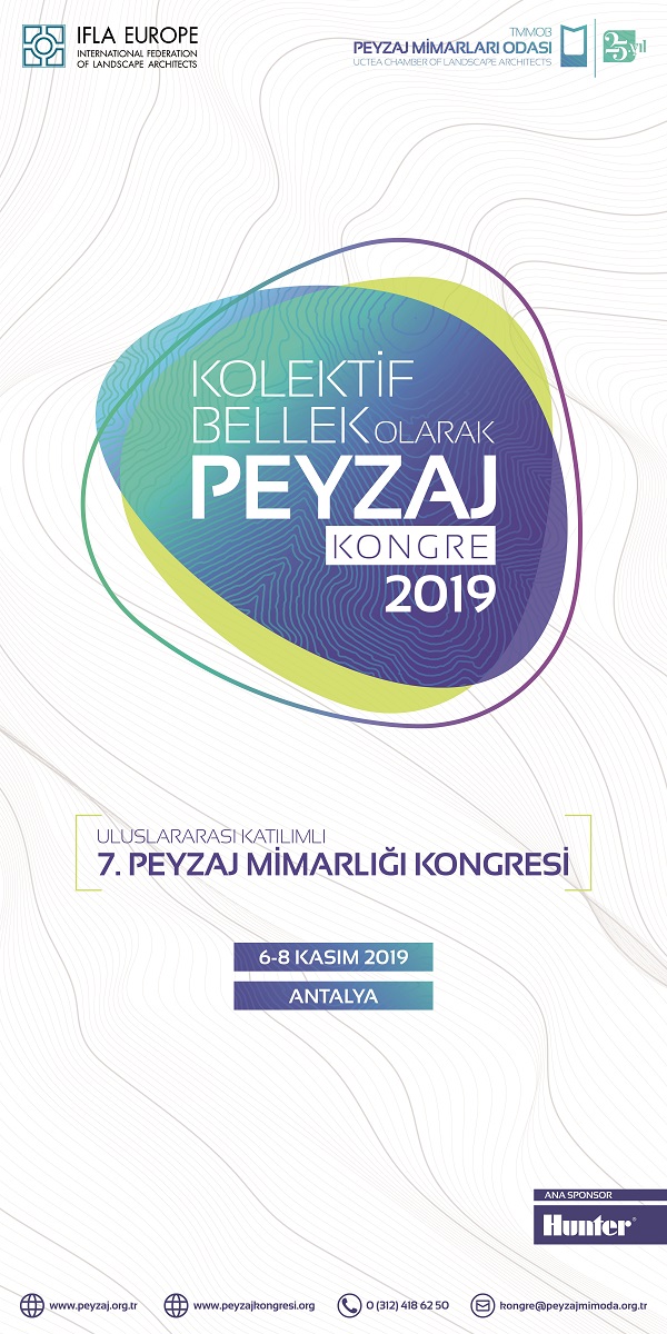 TMMOB Peyzaj Mimarları Odası olarak düzenlediğimiz ve mesleğin geleceğine ışık tutan Kongrelerimizin 7.`sini Oda`mızın kuruluşunun 25. yılında "KOLEKTİF BELLEK OLARAK PEYZAJ" temasıyla 06-08 Kasım 2019 tarihleri arasında uluslararası katılımlı olarak Antalya Akra Hotel`de gerçekleştirilecektir.