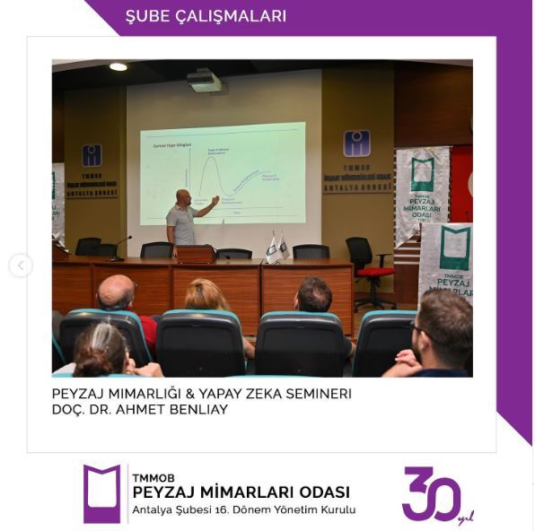 26 Haziran saat 18:30'da İnşaat Mühendisleri Odası Konferans Salonu'nda Akdeniz Üniversitesi Mimarlık Fakültesi Peyzaj Mimarlığı Bölüm Doç. Dr. Ahmet BENLİAY’ın PEYZAJ MİMARLIĞI ve YAPAY ZEKA Semineri başarı ile gerçekleştirilmiştir.Sunumu ve mesleğin gelişimi için vermiş olduğu katkılardan dolayı Hocamız Doç. Dr. Ahmet Benliay’a teşekkür ederiz.