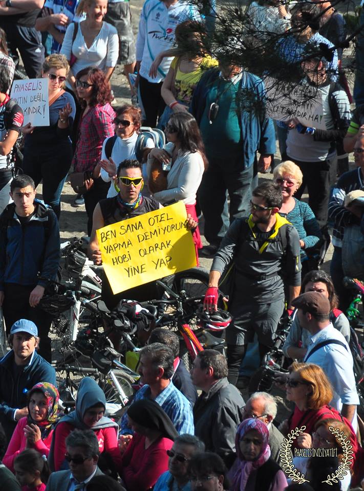 “23 Şubat 2014 tarihinde Phaselis antik kenti içinde yapılan “Phaselis’te otele hayır” mitingine katıldık. Mitingde; Kemer’de bulunan 14 STK’ dan oluşan “Kemer Sivil Toplum Platformu” , çok sayıda sivil inisiyatif, gönüllü gruplar, köy koruma dernekleri, doğa sporları kulüp ve dernekleri ile Antalya Meslek Odaları oradaydı. Phaselis antik kentinin doğal ve arkeolojik değerleri ile korunması gerektiğine inanan 25 grup, oda, dernek, kooperatif “Kemer’de başka Phaselis yoktur. Antalya’da başka Phaselis yoktur. Türkiye’de başka Phaselis yoktur. Dünyada başka Phaselis yoktur” diyerek bir basın açıklaması yaptık.”