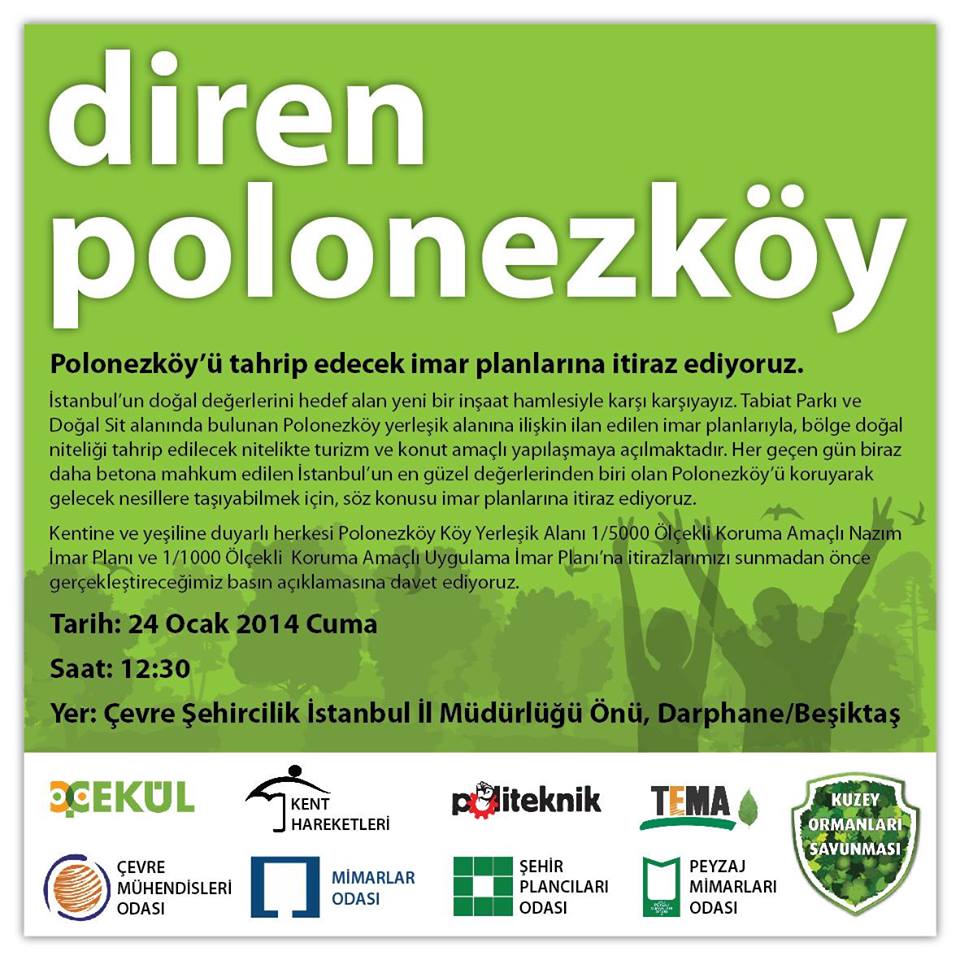 İstanbul İli, Beykoz İlçesi, Polonezköy Köy Yerleşik Alanı’na ilişkin 26.12.2013 - 24.01.2014 tarihleri arasında askıya çıkarılan yeni askı planlarına karşı TMMOB Peyzaj Mimarları Odası İstanbul Şubesi olarak 24 Ocak 2014 Cuma Günü saat 12.30’da ortak basın açıklamasına katıldık.
