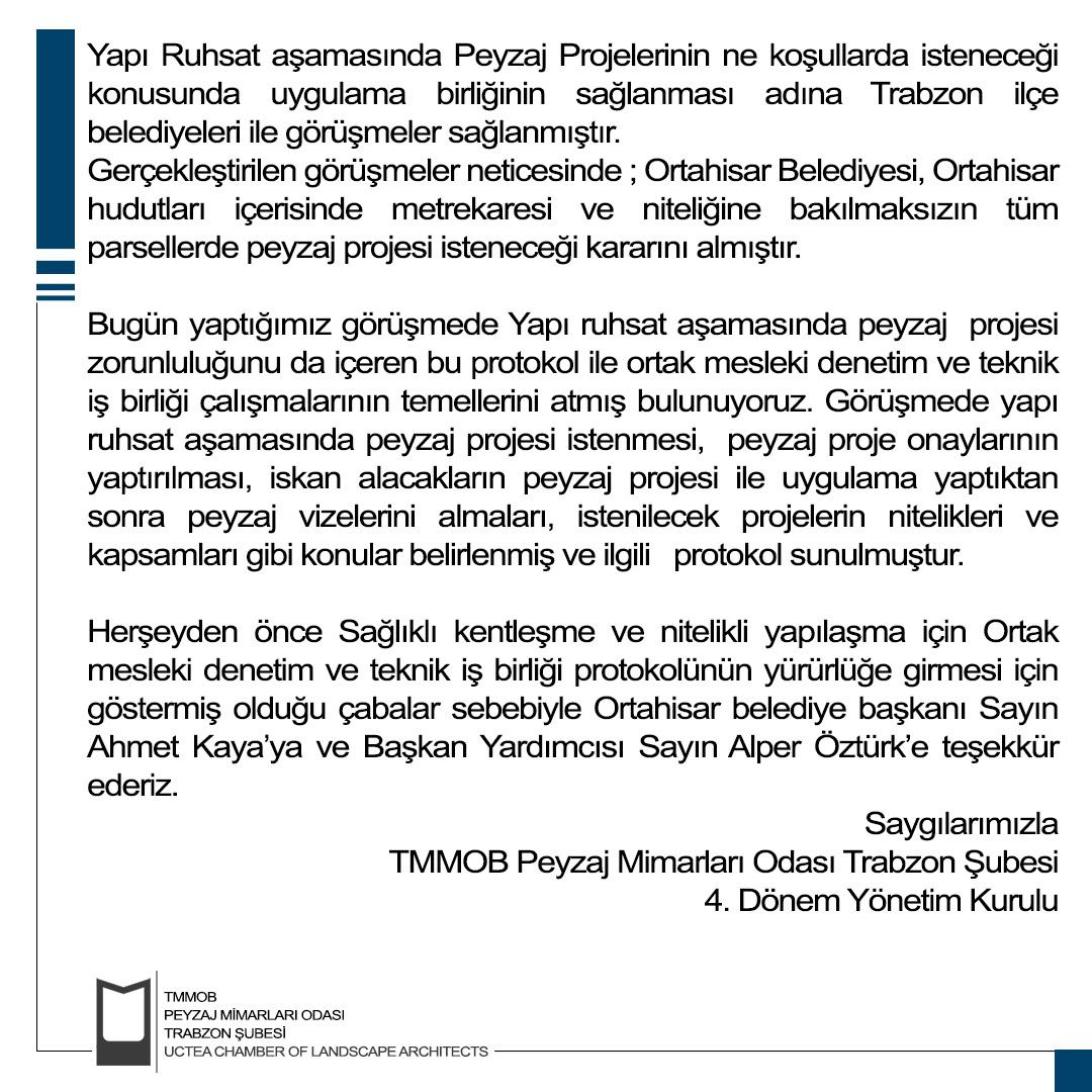Yapı Ruhsat aşamasında Peyzaj Projelerinin ne koşullarda isteneceği konusunda uygulama birliğinin sağlanması adına Trabzon ilçe belediyeleri ile görüşmeler sağlanmıştır.Gerçekleştirilen görüşmeler neticesinde ; Ortahisar Belediyesi, Ortahisar hudutları içerisinde metrekaresi ve niteliğine bakılmaksızın tüm parsellerde peyzaj projesi isteneceği kararını almıştır.