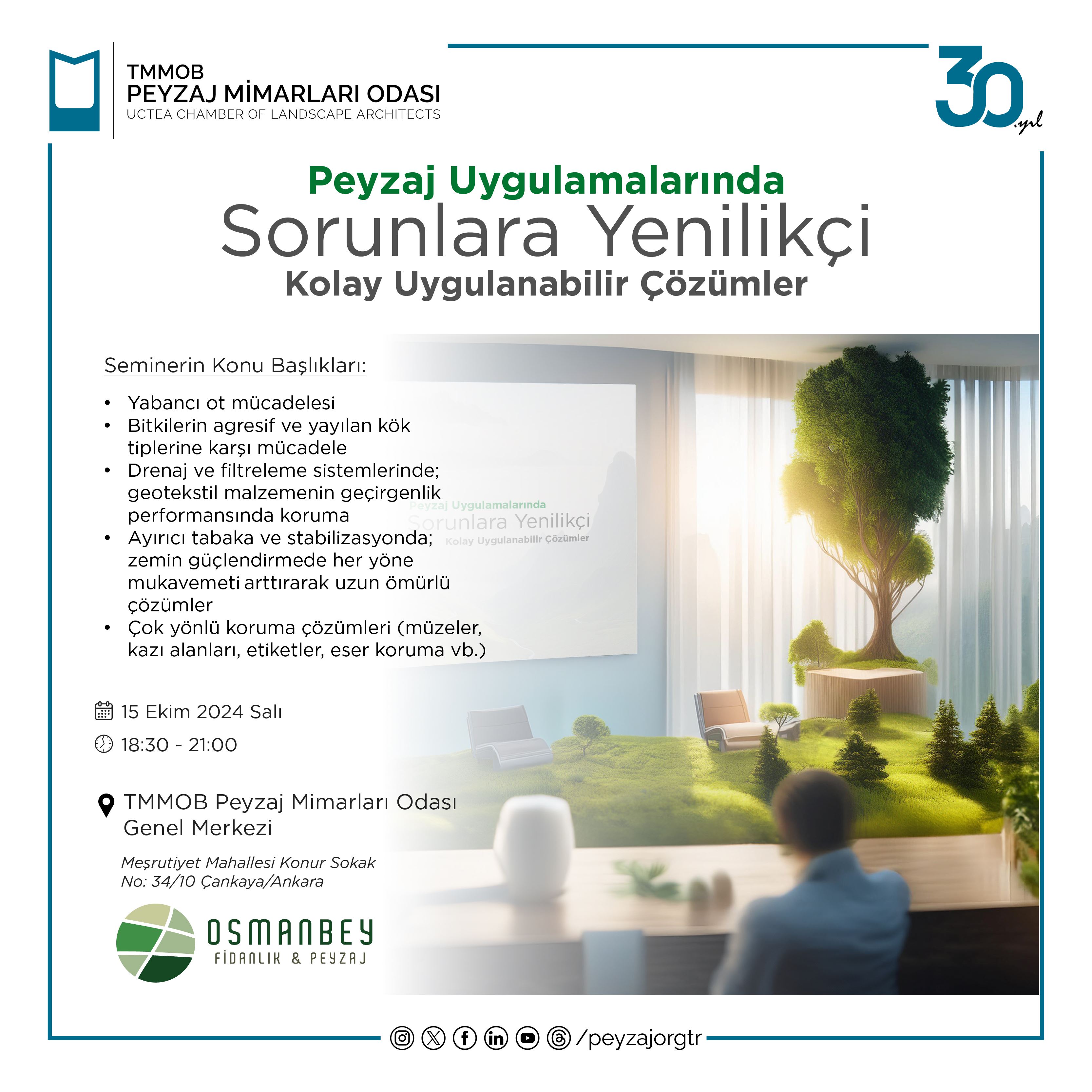 “Peyzaj Uygulamalarında Sorunlara Yenilikçi, Kolay Uygulanabilir Çözümler” semineri 15 Ekim 2024 Salı günü 18.30-21.00 saatleri arasında Genel Merkez eğitim salonumuzda (Meşrutiyet Mah. Konur Sok. No: 34/10 Çankaya/Ankara) gerçekleştirilecektir.