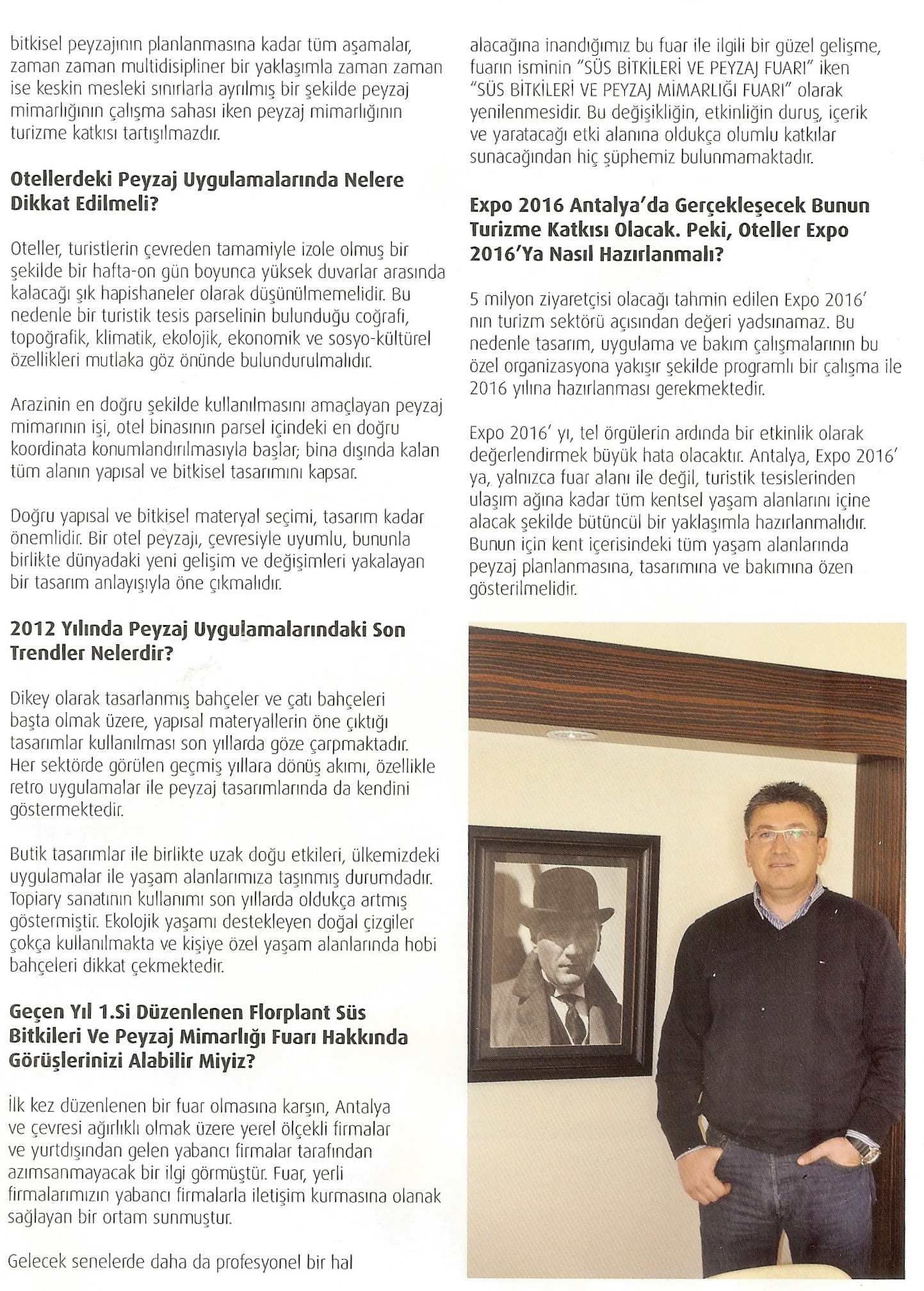 Antalya‘nın turizm ve aktüalite konseptli yayını GM Dergisi‘nin Şube Yönetim Kurulu Başkanımız Teoman AKÇALI ile gerçekleştirdiği görüşmede, mesleğimizin ülke turizmine etkisi, Florplant Süs Bitkileri ve Peyzaj Mimarlğı Fuarı ve Expo 2016 konuları irdelenmiştir.